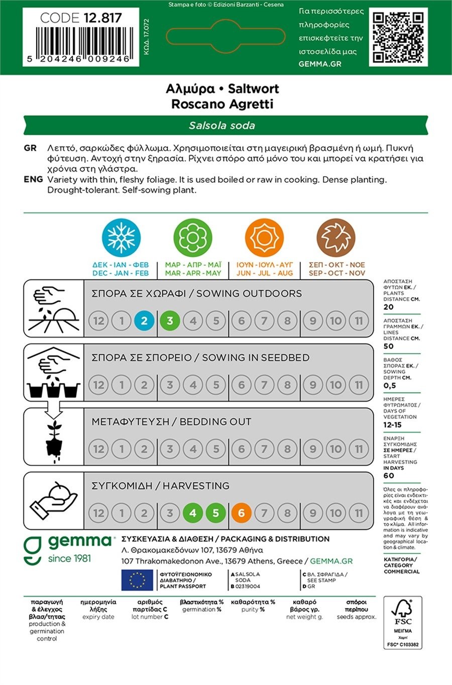 Η Αλμύρα (Agretti) Gemma (Salsola soda) είναι γκουρμέ λαχανικό με λεπτό, σαρκώδες φύλλωμα και εξαιρετική γεύση. Καλλιεργείται εύκολα ως μονοετές, με πυκνή φύτευση και υψηλή αντοχή στην ξηρασία, ιδανική για κήπο και γλάστρα στο μπαλκόνι. Χρησιμοποιείται ωμή ή βραστή σε σαλάτες και πιάτα θαλασσινών—το μυστικό των ιταλικών τρατοριών στο σπίτι σου.