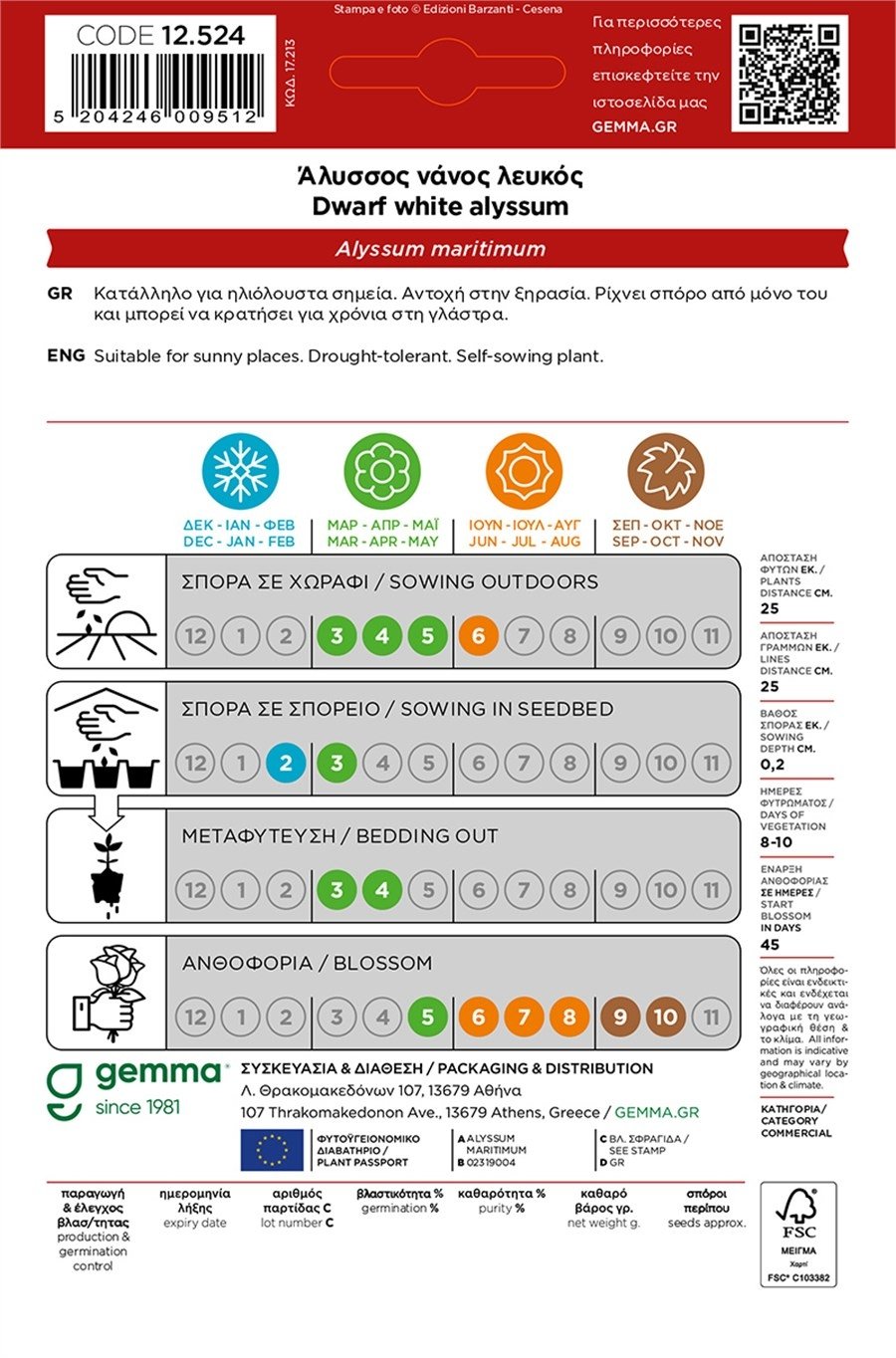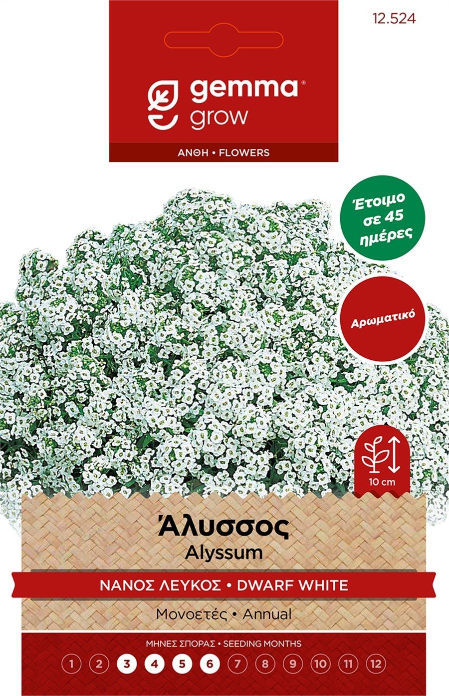 Ο Άλυσσος Λευκός Νάνος Gemma (Alyssum maritimum) είναι ένα μονοετές, αρωματικό και ανθεκτικό φυτό με πλούσια λευκή ανθοφορία και υπέροχο άρωμα. Αναπτύσσεται γρήγορα, ανθίζει μέσα σε 45 ημέρες και είναι ιδανικό για παρτέρια, γλάστρες, βραχόκηπους και μπαλκόνια.