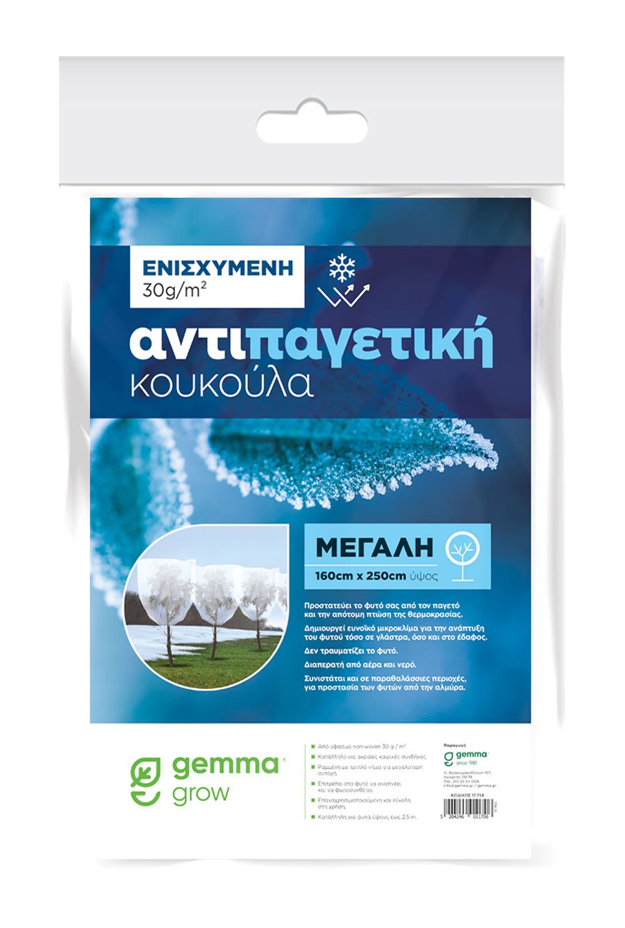 Η Αντιπαγετική Κουκούλα 30g Μεγάλη (2,50 m) προσφέρει έξτρα ενισχυμένη προστασία απέναντι στον παγετό, την αλμύρα, τον δυνατό άνεμο και τα ακραία καιρικά φαινόμενα. Με μεγάλο ύψος και πλάτος 1,60 m x 2,50 m, καλύπτει άνετα καλλωπιστικά, εσπεριδοειδή, νεαρά δέντρα και κάθε ευαίσθητο φυτό που χρειάζεται ασπίδα από τις χαμηλές θερμοκρασίες.