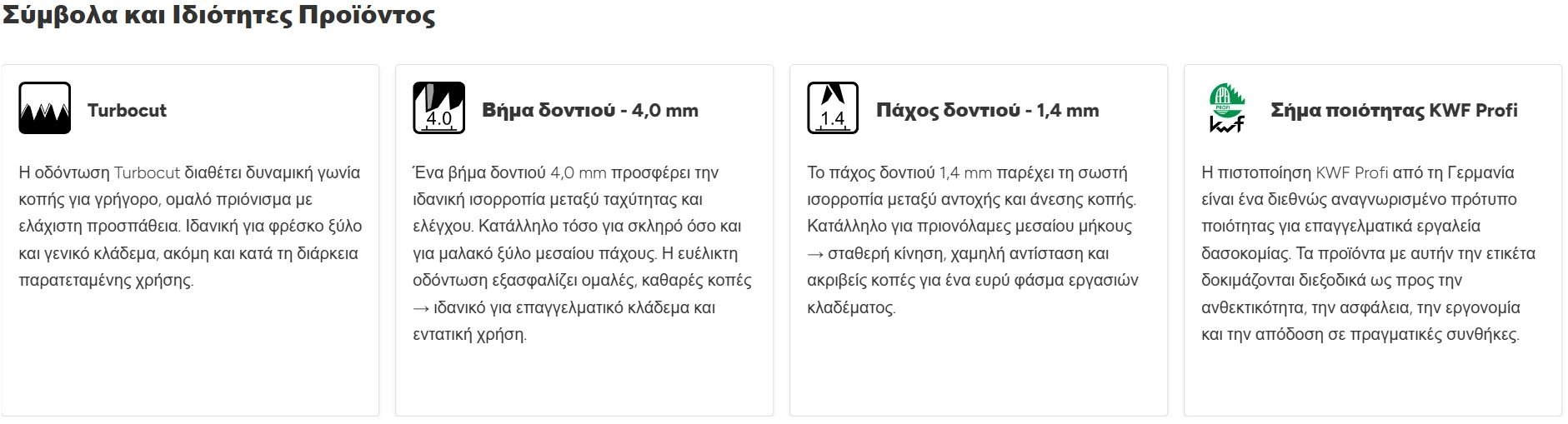 Κατασκευασμένη από χάλυβα υψηλής περιεκτικότητας σε άνθρακα, με σκληρή επιχρωμίωση, καμπυλωτή λείανση, σκληρυμένο ώμο και τεχνολογία Turbocut, προσφέρει δυνατή, καθαρή και ελεγχόμενη κοπή σε κλαδιά έως 95 mm. Η πιστοποίηση KWF Profi επιβεβαιώνει ότι η λεπίδα πληροί τα αυστηρότερα επαγγελματικά πρότυπα για μακροχρόνια και απαιτητική χρήση.