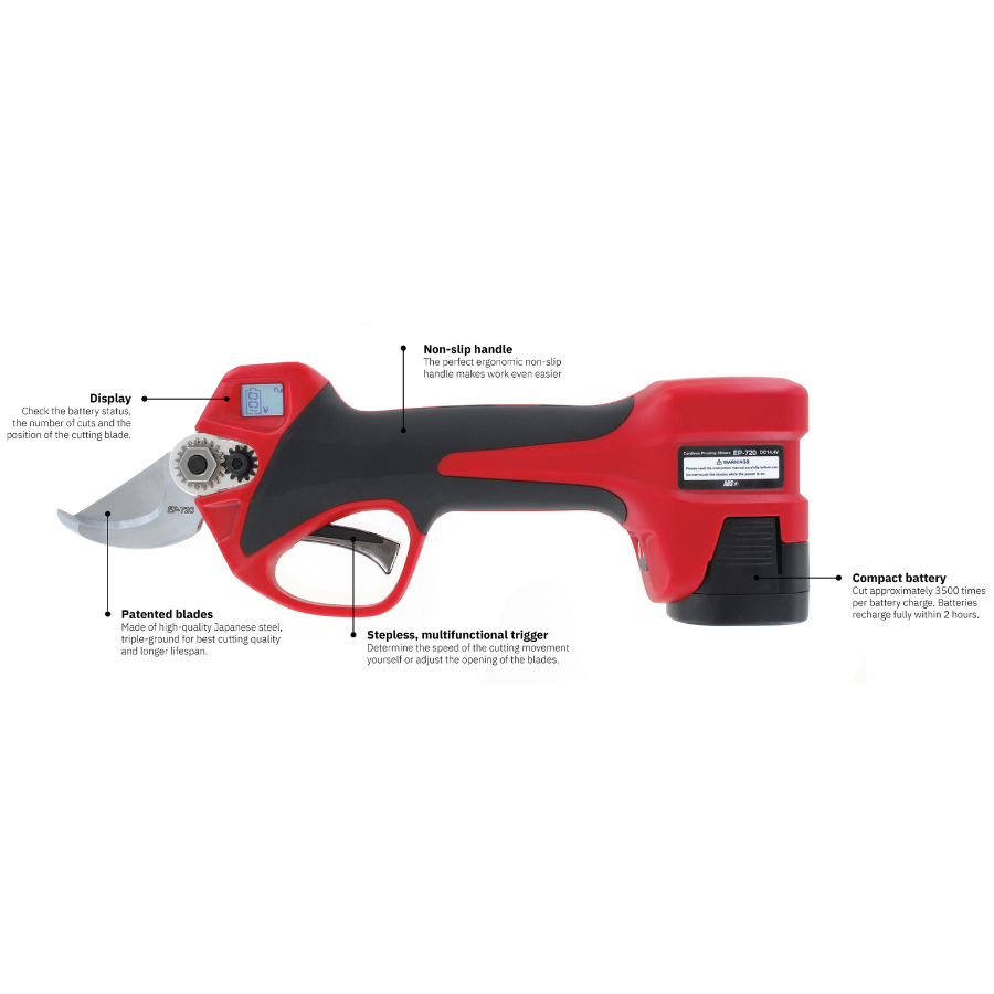 Το ARS EP-720 είναι ένα επαγγελματικό ασύρματο κλαδευτήρι μπαταρίας, σχεδιασμένο για μέγιστη απόδοση, ακρίβεια και εργονομία σε απαιτητικές εργασίες. Η τριπλά τροχισμένη ιαπωνική λεπίδα σε συνδυασμό με την πατενταρισμένη κάτω λεπίδα μειώνουν αισθητά την αντίσταση κοπής, προσφέροντας πιο ομαλή λειτουργία και μεγαλύτερη αυτονομία μπαταρίας.