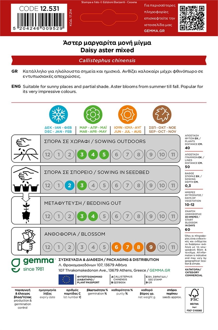Η Άστερ Μαργαρίτα Μίγμα Gemma (Callistephus chinensis) είναι ένα μονοετές, εντυπωσιακό φυτό με πολύχρωμα άνθη που στολίζουν τον κήπο ή το μπαλκόνι από το καλοκαίρι έως το φθινόπωρο. Καλλιεργείται εύκολα, αγαπά τη ζέστη και την ηλιοφάνεια αλλά προσαρμόζεται άριστα και σε ημισκιερές θέσεις.