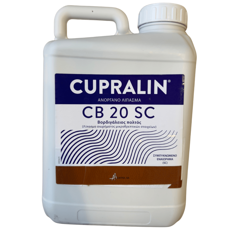 Το Cupralin CB 20 SC είναι ένας συμπυκνωμένος βορδιγάλειος πολτός μικροθρεπτικών στοιχείων, ιδανικός για την ενίσχυση της θρέψης και της φυσικής άμυνας των φυτών. Χάρη στη σύνθεσή του, εξασφαλίζει ομοιόμορφη κάλυψη, σταθερή δράση και άμεση διαθεσιμότητα χαλκού, προσφέροντας σημαντική υποστήριξη σε πλήθος καλλιεργειών.
