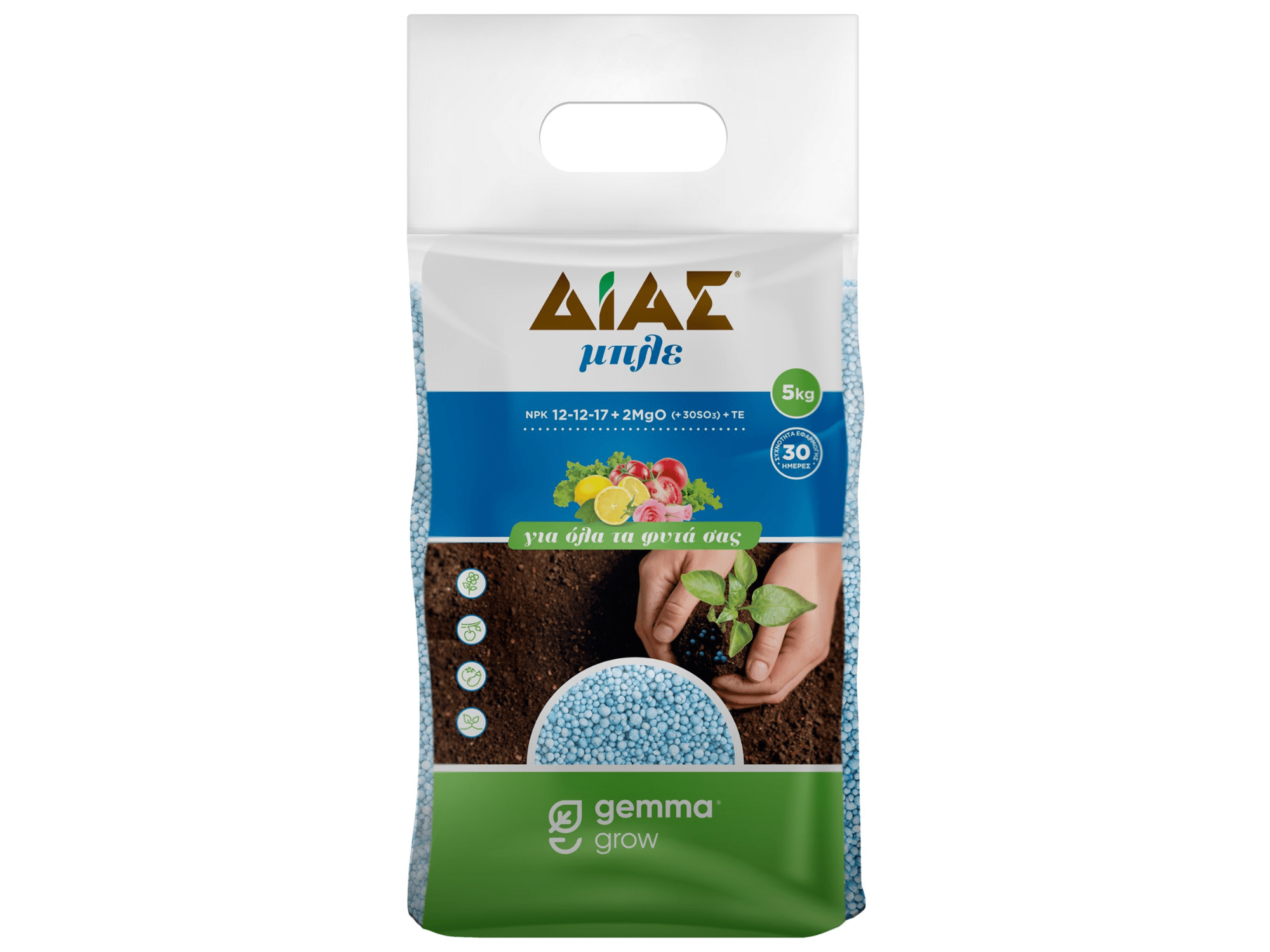 Το ΔΙΑΣ μπλε 12-12-17+2MgO 5Kg είναι η value και επαγγελματική επιλογή για μεγάλες εκτάσεις ή πολλές φυτεύσεις. Η ομοιομορφία κόκκου προσφέρει ίδιες συνθήκες θρέψης σε όλο το χωράφι/κήπο, οδηγώντας σε συγχρονισμένη ανάπτυξη και καρπόδεση. Με SOP βάση, χωρίς σκόνη και άριστες πρώτες ύλες, μεγιστοποιεί την απόδοση της λίπανσης.
