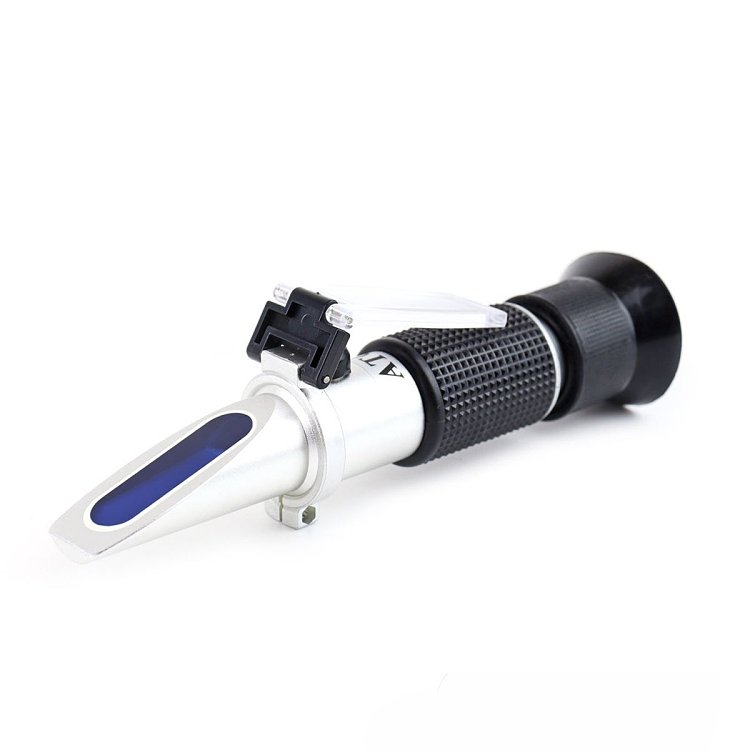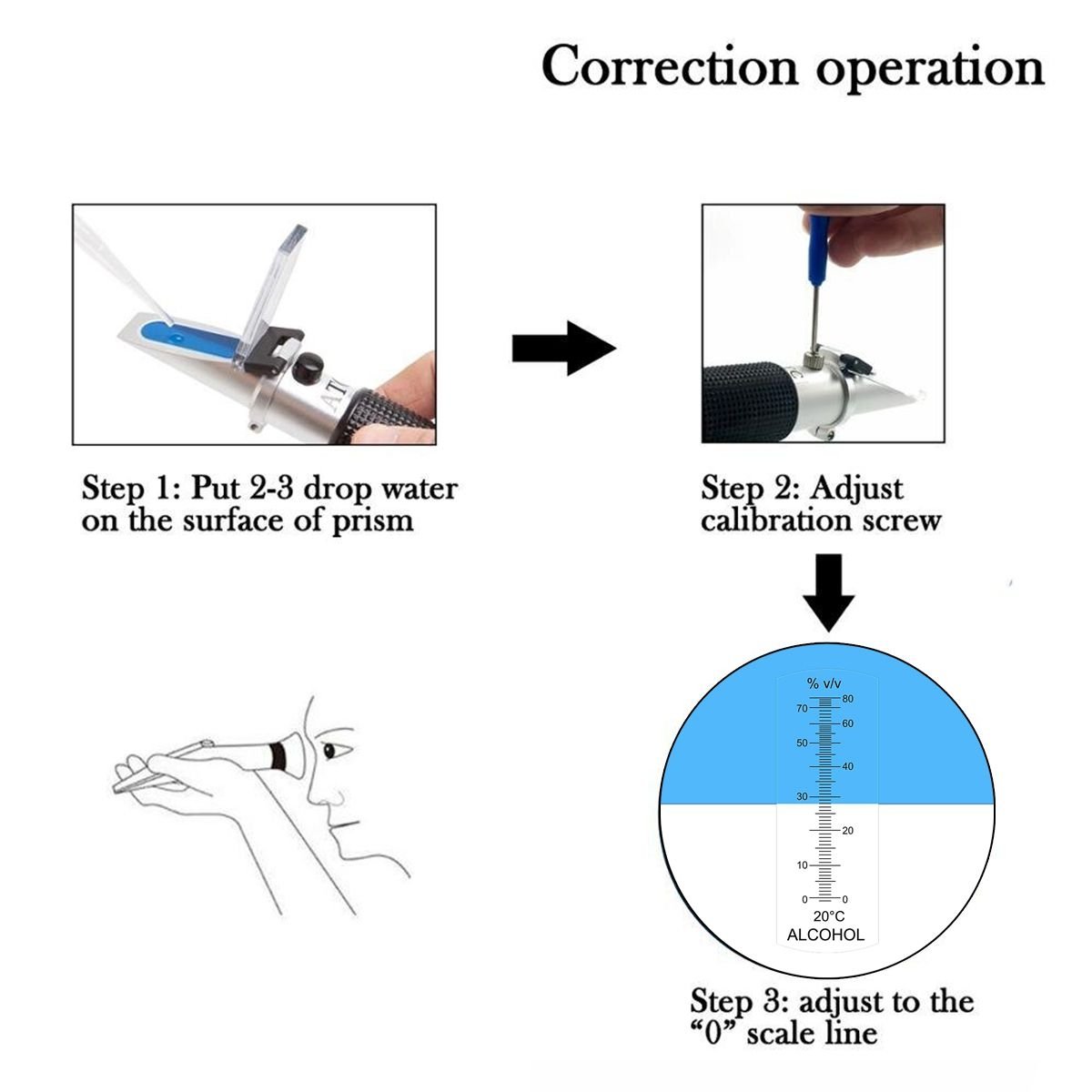 ● Βαθμονόμηση: Τοποθετήστε 2-3 σταγόνες αποσταγμένου νερού στο πρίσμα και ρυθμίστε τη βίδα μέχρι η γραμμή να δείξει το "0".