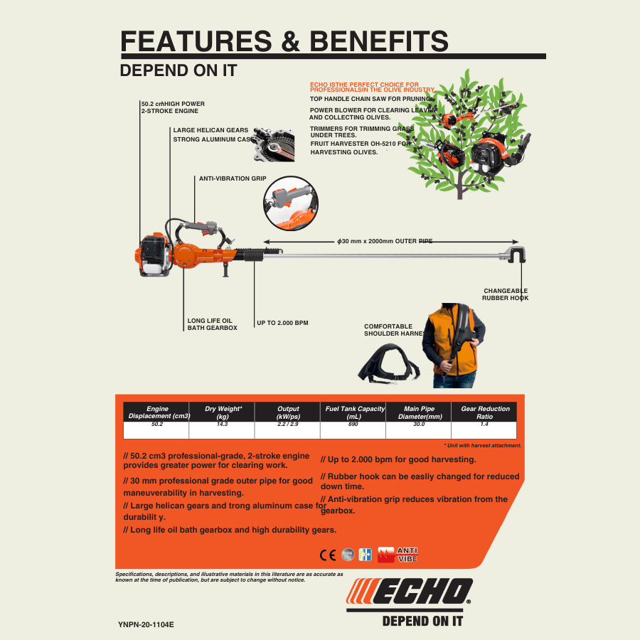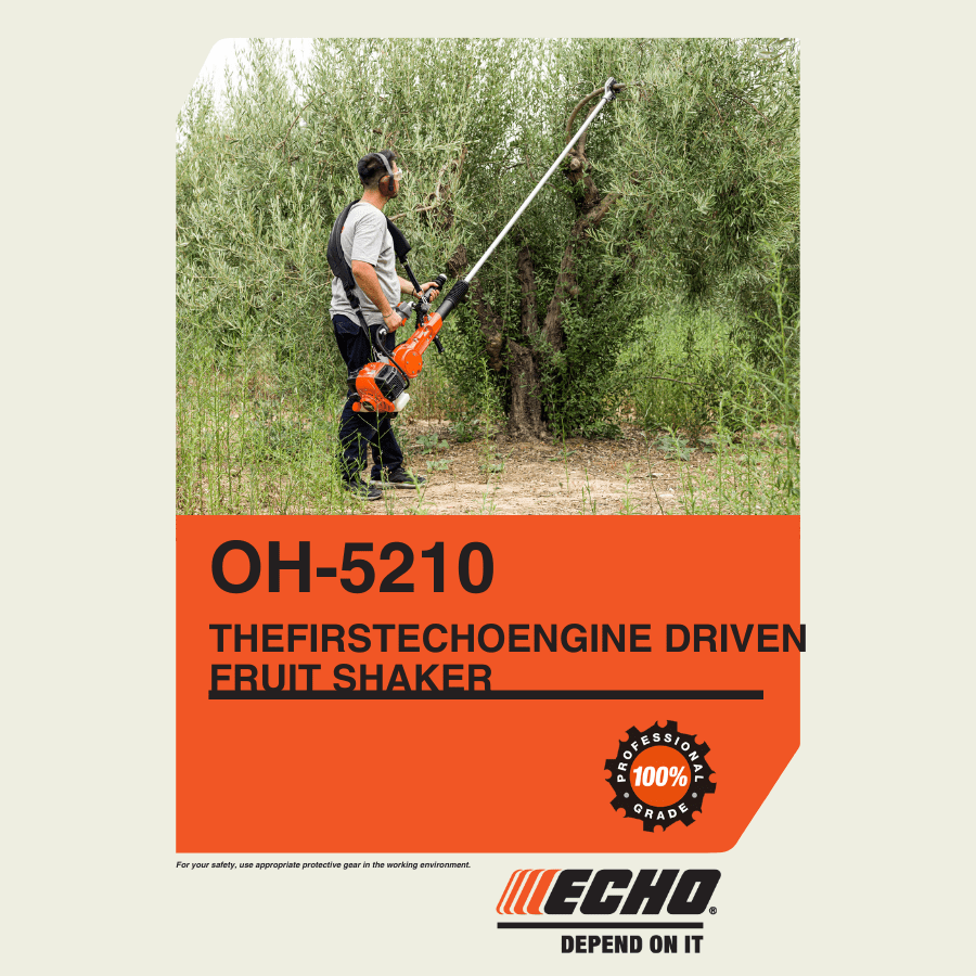 Το ECHO OH-5210 είναι επαγγελματικό τινακτικό–δονητικό μηχάνημα σχεδιασμένο για μέγιστη παραγωγικότητα στη συγκομιδή ελιάς και άλλων καρπών όπως αμύγδαλα, φυστίκια και καρύδια. Ο ισχυρός δίχρονος κινητήρας 50,2 cm³ προσφέρει σταθερή δύναμη, ενώ η βαριάς κατασκευής μετάδοση εξασφαλίζει αξιοπιστία σε πολύωρη εργασία.