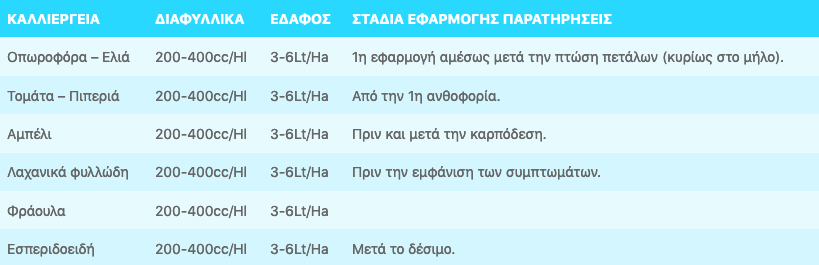 ● Λαχανικά φύλλωσης: 200–400cc/hl · 3–6lt/Ha – Πριν την εμφάνιση συμπτωμάτων