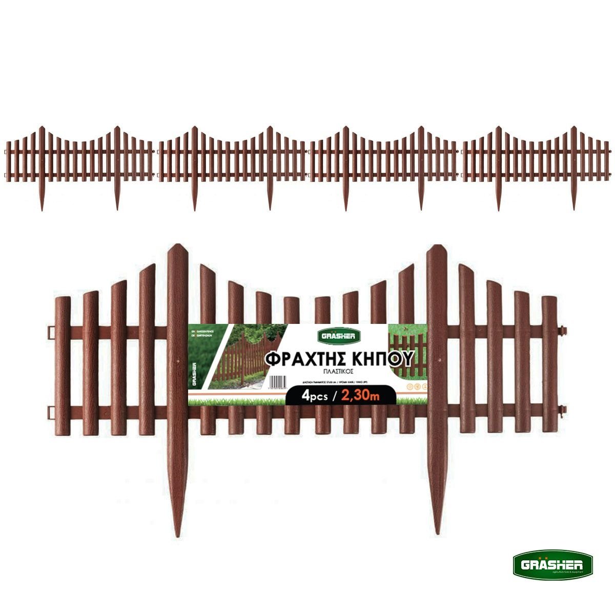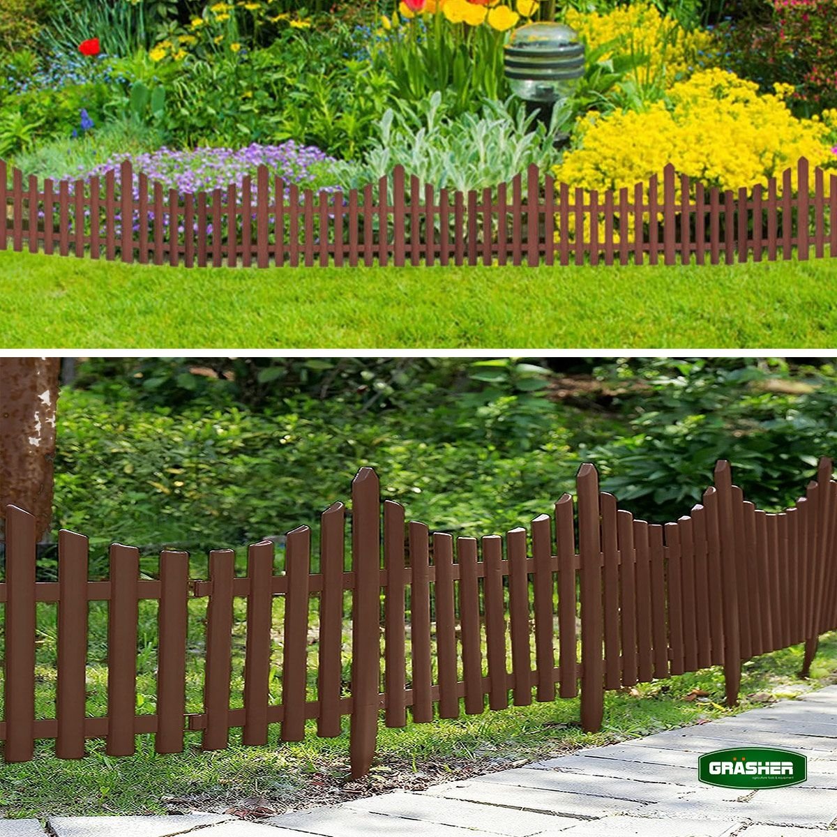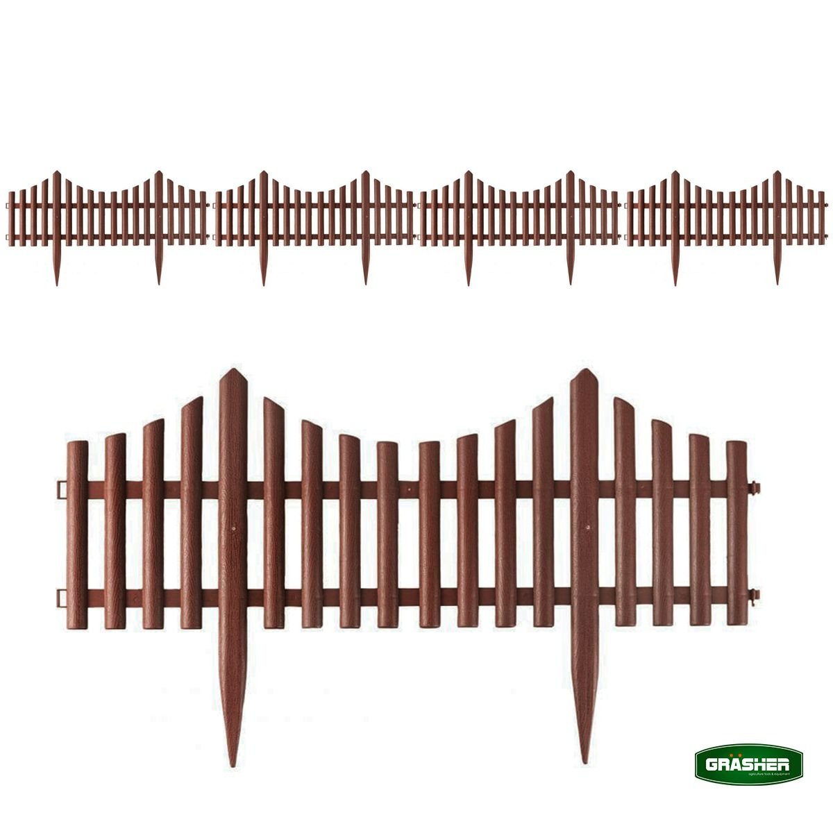 Ο πλαστικός φράχτης κήπου Grasher σε ζεστό καφέ χρώμα προσφέρει μια κομψή εναλλακτική με αίσθηση φυσικού ξύλου, χωρίς τη φθορά και τη συντήρηση που απαιτεί το πραγματικό ξύλο. Το σετ περιέχει 4 αρθρωτά τμήματα με συνολική κάλυψη 2,30 μέτρων και ύψος 33 cm, ιδανικό για οριοθέτηση παρτεριών, μονοπατιών και ανθόκηπων.