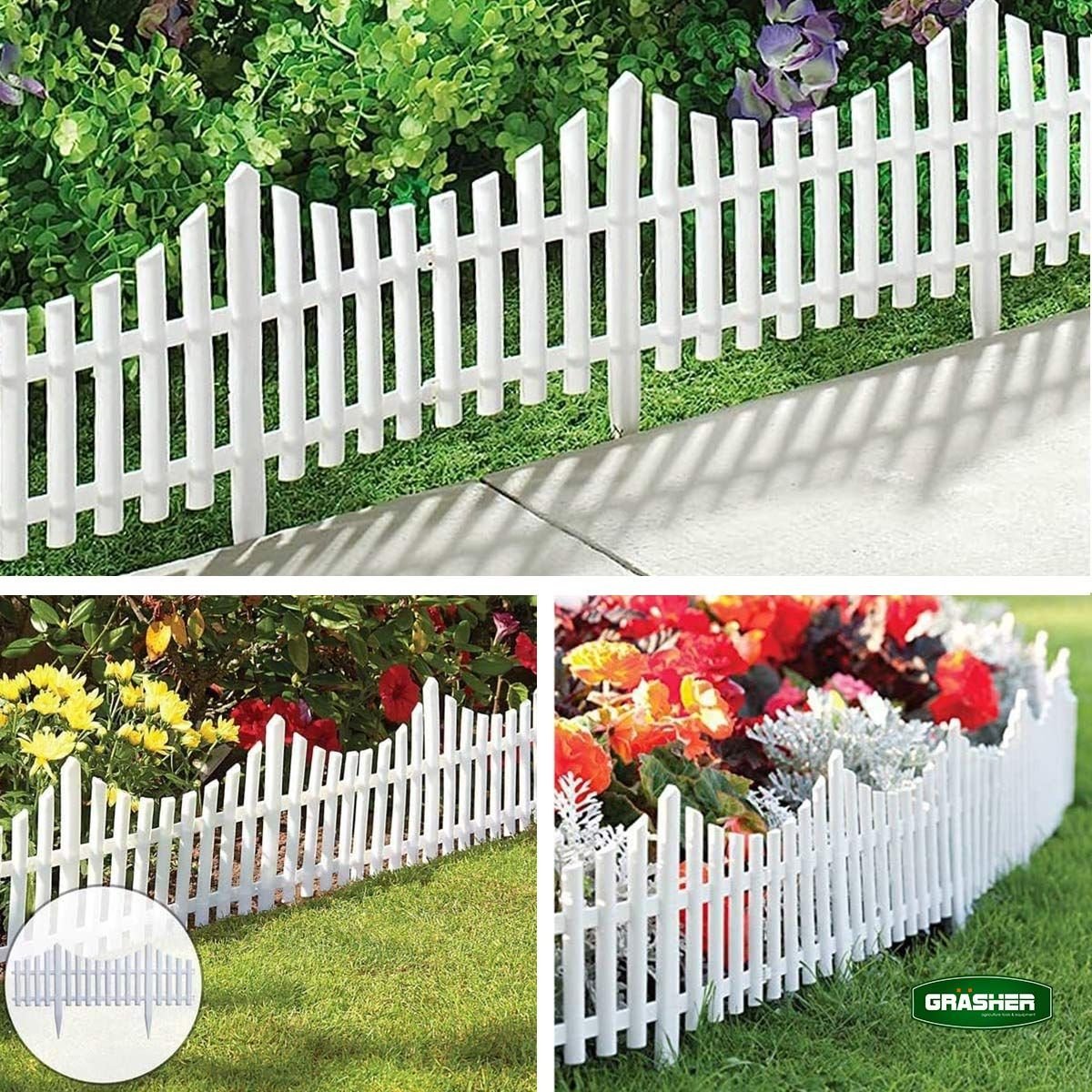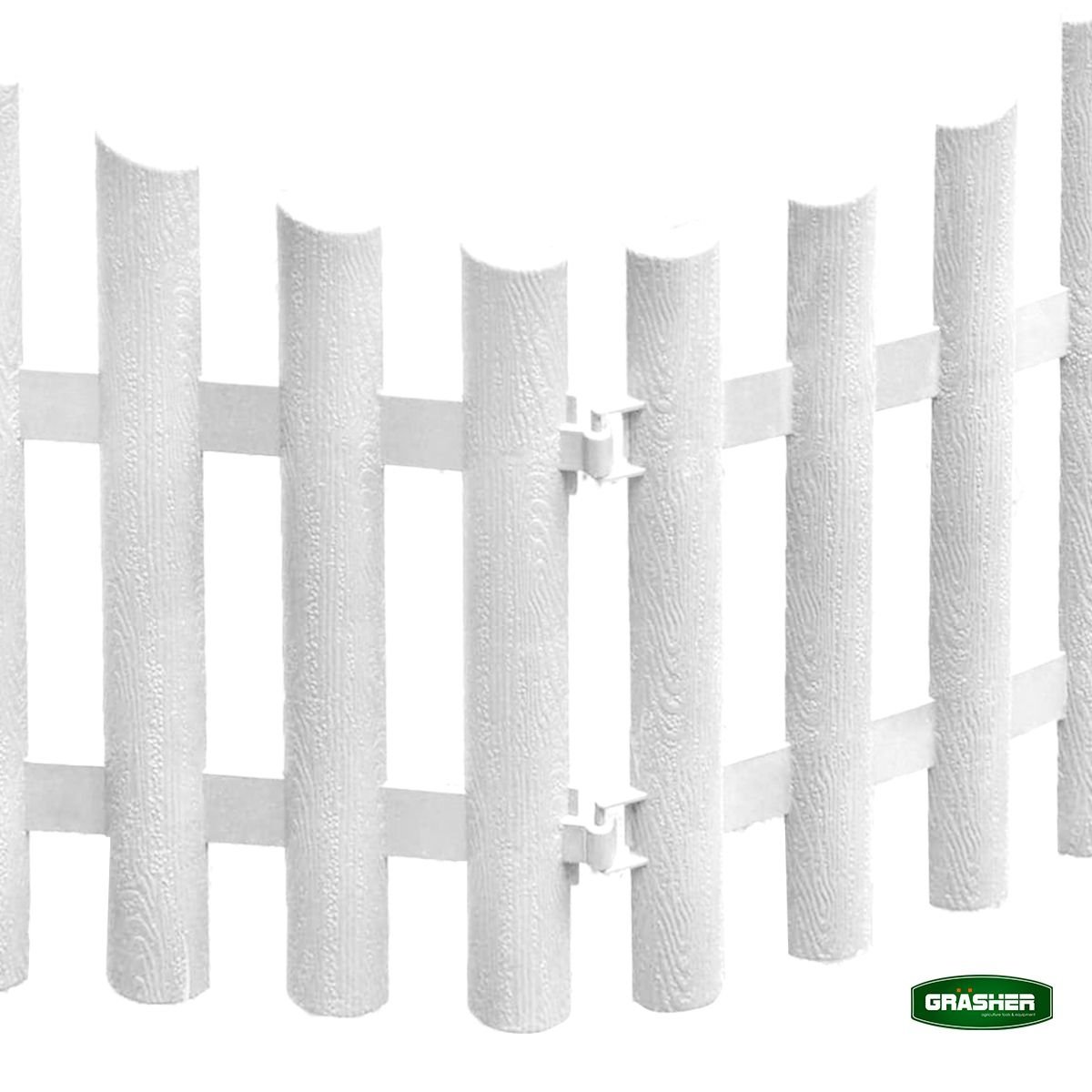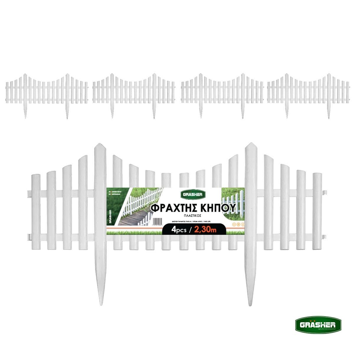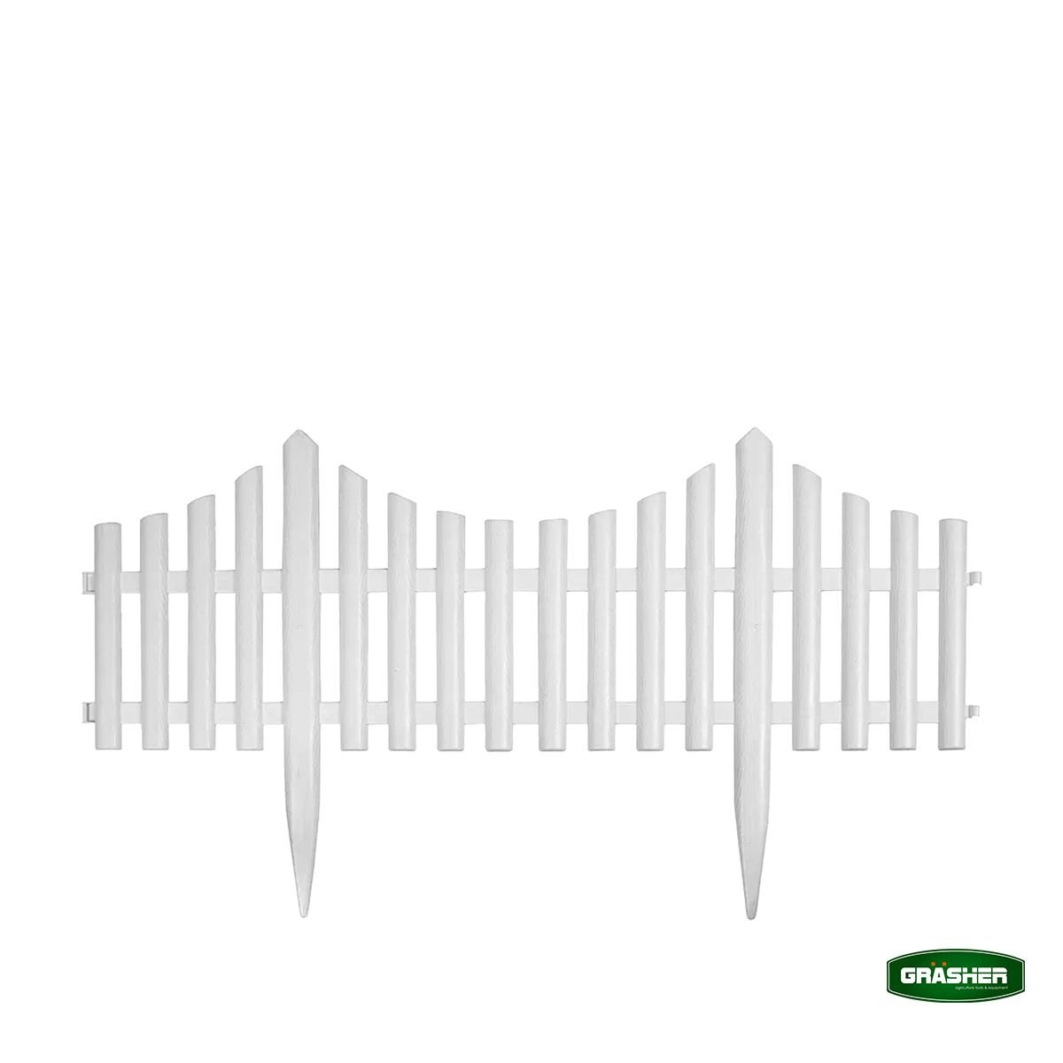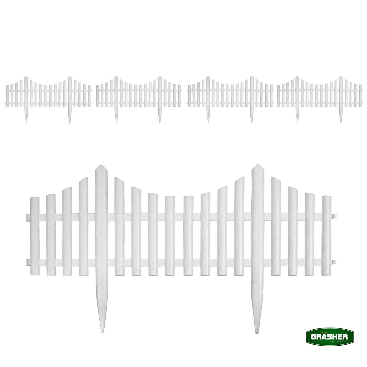 Ο πλαστικός φράχτης κήπου Grasher σε λευκό χρώμα είναι μια πρακτική και διακοσμητική λύση για την οριοθέτηση παρτεριών, μονοπατιών και κήπων. Το σετ περιλαμβάνει 4 αρθρωτά τμήματα που συνδέονται μεταξύ τους και καλύπτουν συνολικό μήκος 2,30 μέτρων, με ύψος 33 cm ανά τμήμα.