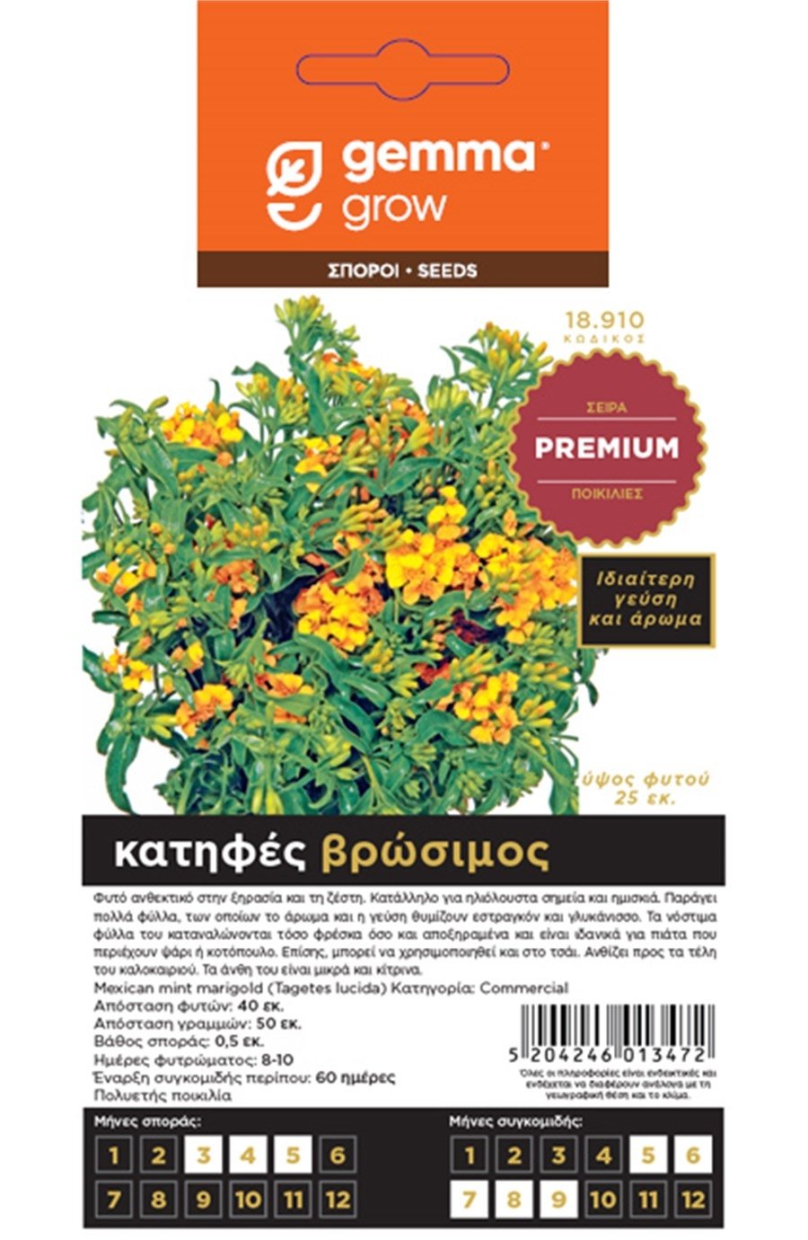 Ο Κατηφές Βρώσιμος Gemma PREMIUM είναι ένα ξεχωριστό πολυετές αρωματικό φυτό, γνωστό για τη μοναδική του γεύση και άρωμα που θυμίζουν εστραγκόν και γλυκάνισσο. Ανθεκτικός στη ζέστη και την ξηρασία, αναπτύσσεται άριστα σε ηλιόλουστα ή ημισκιερά σημεία και παράγει άφθονα φύλλα υψηλής ποιότητας.