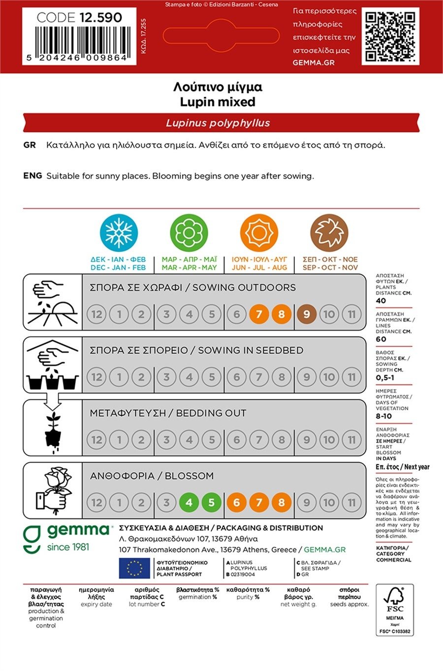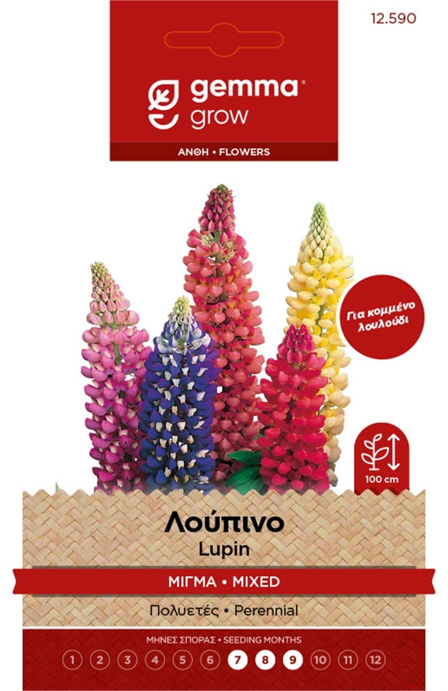 Το Λούπινο Μίγμα Gemma είναι ένα εντυπωσιακό, πολυετές φυτό ιδανικό για όσους αγαπούν τα ψηλά άνθη και τα κομμένα λουλούδια. Με ύψος έως 100 cm και πλούσιες ανθοταξίες, προσφέρει εξαιρετική διακοσμητική αξία σε παρτέρια και ανθώνες.