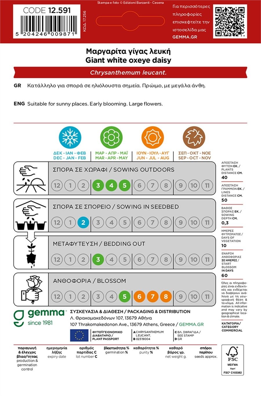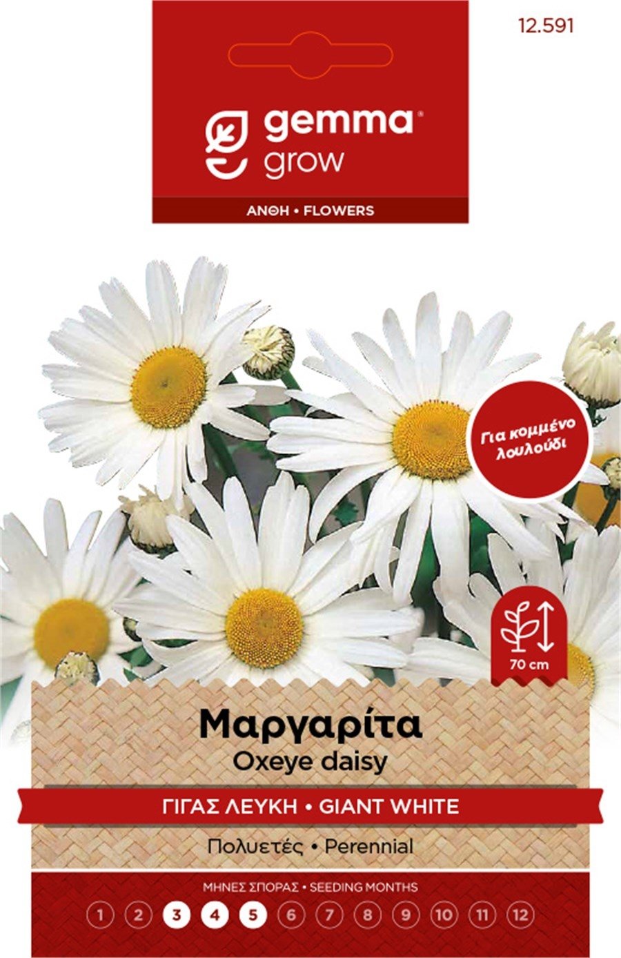 Η Μαργαρίτα Γίγας Λευκή Gemma είναι μια εντυπωσιακή, πολυετής ποικιλία που ξεχωρίζει για τα μεγάλα, πρώιμα άνθη της και την εξαιρετική αντοχή της. Ιδανική για κομμένο λουλούδι, προσφέρει πλούσια και φωτεινή ανθοφορία που χαρίζει άμεσα κομψότητα σε κάθε χώρο.