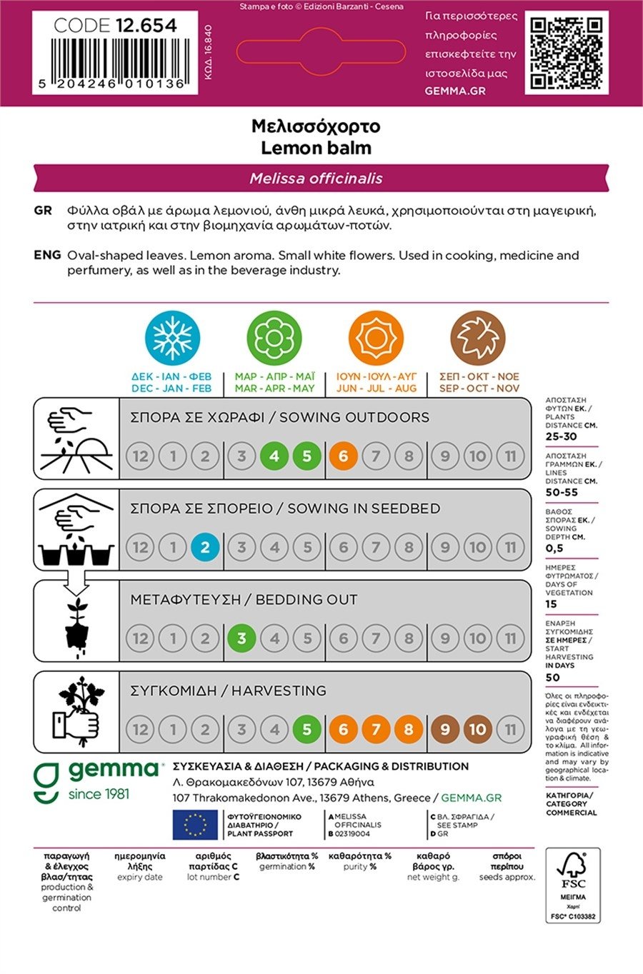 Το Μελισσόχορτο Gemma (Melissa officinalis) είναι ένα αρωματικό πολυετές φυτό με μοναδικό άρωμα λεμονιού, ιδανικό για μαγειρική, αφεψήματα, φαρμακευτική χρήση αλλά και για φυσική αρωματική καλλιέργεια στον κήπο. Αναπτύσσεται γρήγορα, με άνθη μικρά λευκά και φύλλα υψηλής ποιότητας που παραμένουν παραγωγικά για χρόνια.