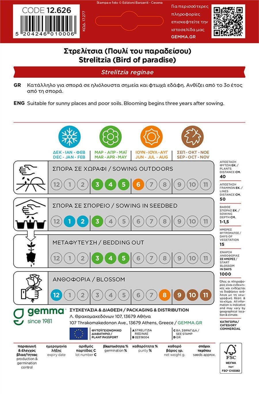 Η Στρελίτσια Gemma (Strelitzia reginae) είναι ένα από τα πιο εντυπωσιακά και εξωτικά κομμένα λουλούδια, γνωστή για τα χαρακτηριστικά «πουλί του παραδείσου» άνθη της. Ως πολυετές, ανθεκτικό φυτό, προσαρμόζεται εξαιρετικά σε ηλιόλουστα σημεία και ακόμη και σε φτωχά εδάφη, χαρίζοντας δυνατή και εντυπωσιακή ανάπτυξη.
