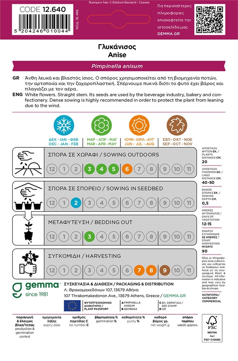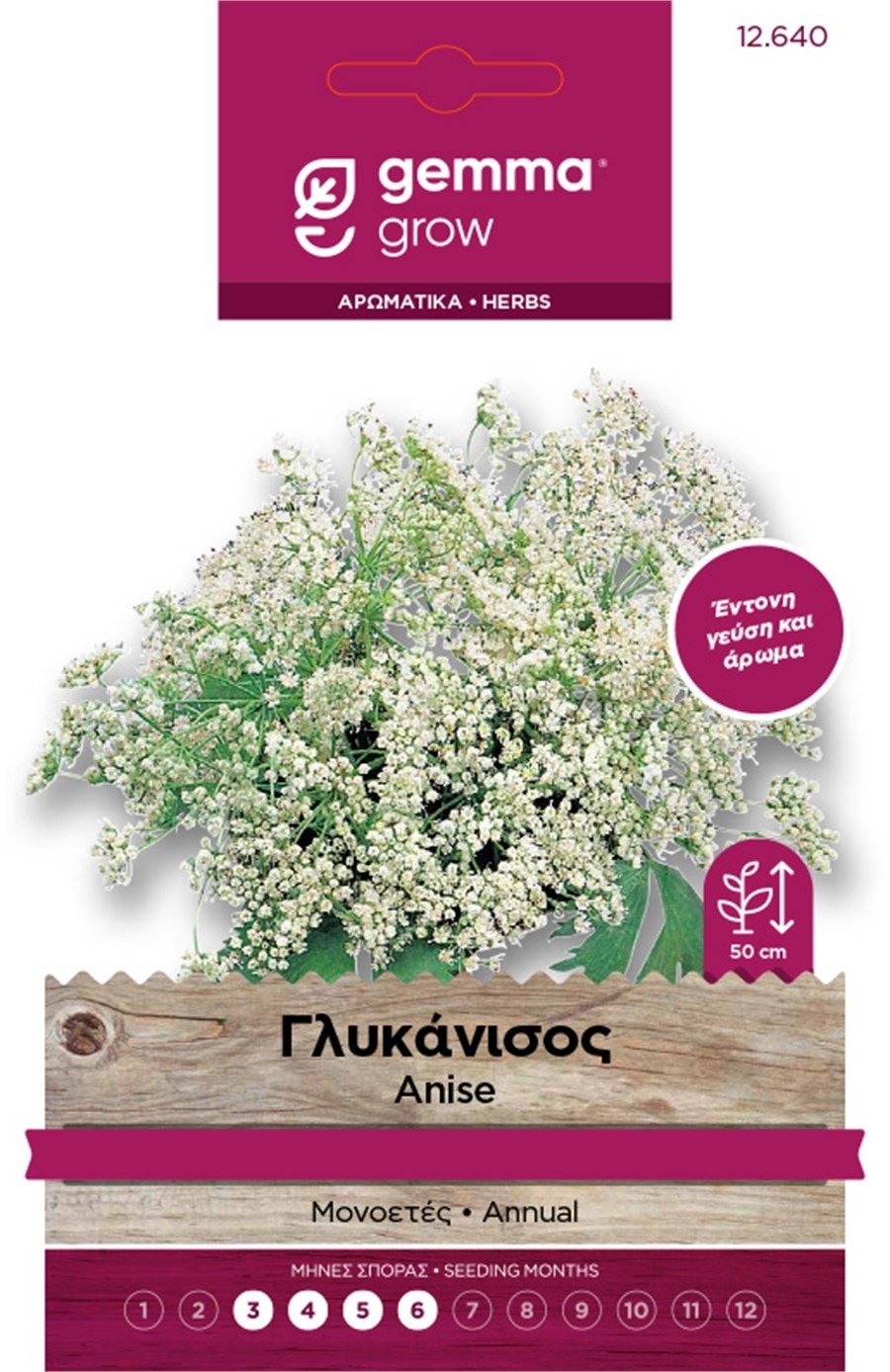 Ο Γλυκάνισος Gemma (Pimpinella anisum) είναι ένα μονοετές, αρωματικό φυτό με λευκά άνθη και ίσιο βλαστό, που χαρίζει έντονη γεύση και χαρακτηριστικό άρωμα. Οι σπόροι του χρησιμοποιούνται ευρέως στη βιομηχανία ποτών, στην αρτοποιία και τη ζαχαροπλαστική, αποτελώντας φυσική επιλογή για ροφήματα, λικέρ ή γλυκά.