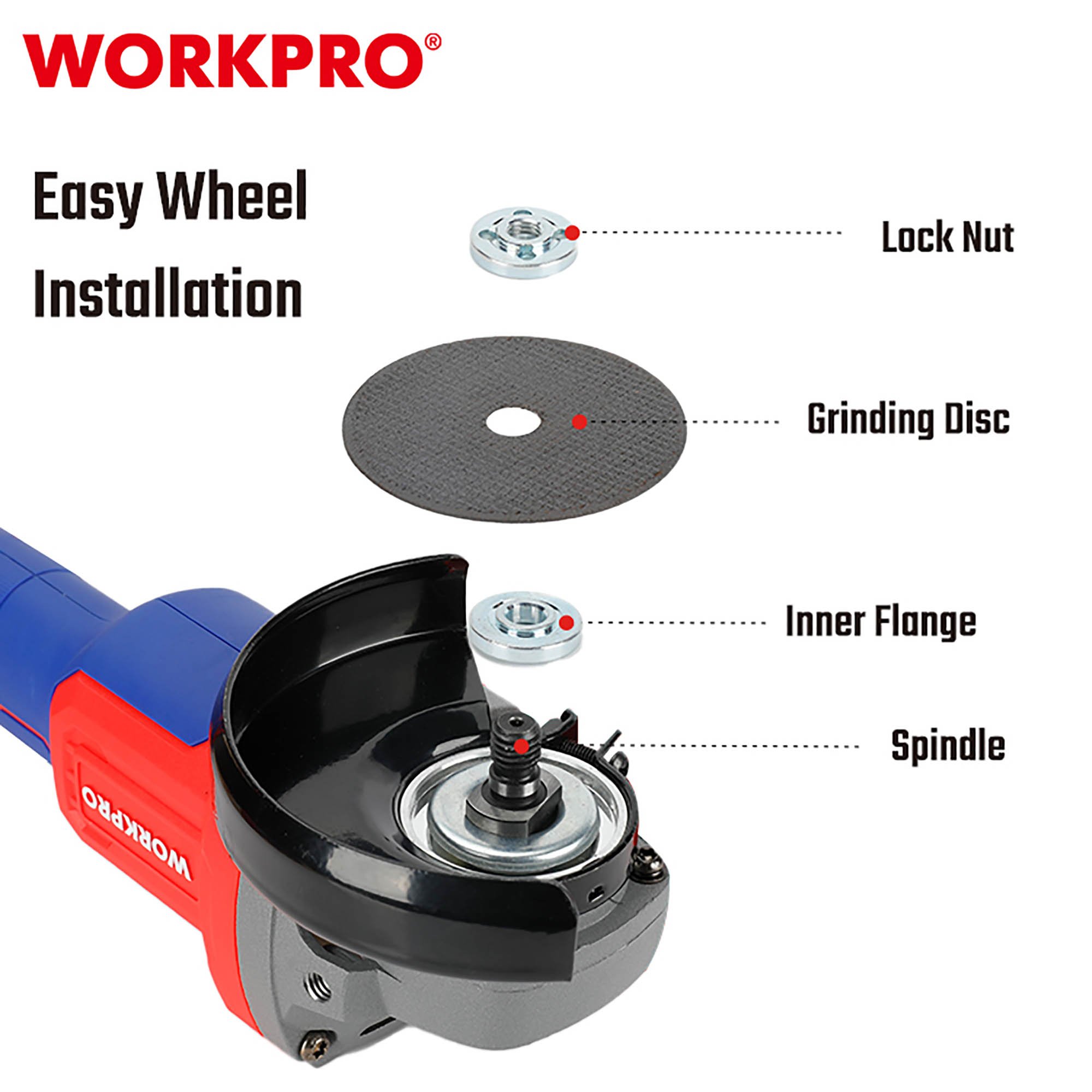 Ο Επαναφορτιζόμενος Γωνιακός Τροχός WORKPRO WP392004 20V-Li BL SOLO συνδυάζει απόδοση, ασφάλεια και ελευθερία κινήσεων.