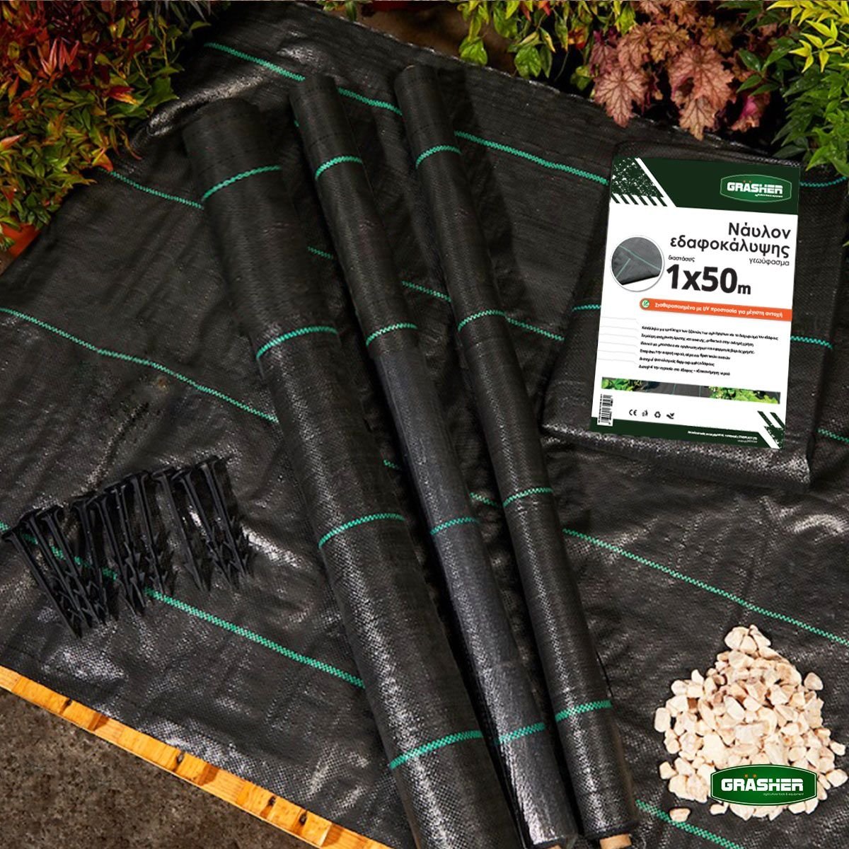 Το Grasher Νάυλον Εδαφοκάλυψης 1x50m είναι ένα υψηλής ποιότητας γεωύφασμα ειδικά σχεδιασμένο για έλεγχο ζιζανίων, σταθεροποίηση εδάφους και προστασία καλλιεργειών. Με βάρος 95 gr/m² και UV προστασία 5 ετών, εξασφαλίζει μεγάλη αντοχή στον ήλιο και στις καιρικές συνθήκες.