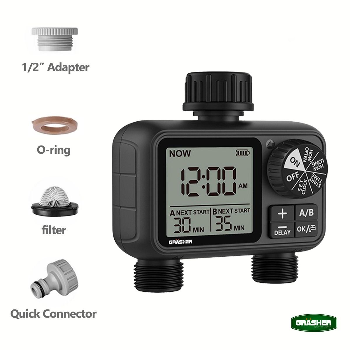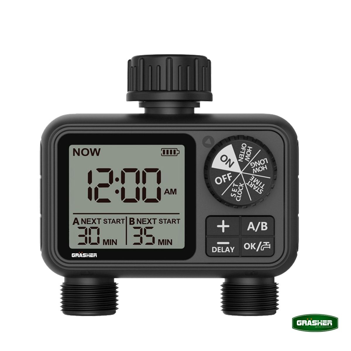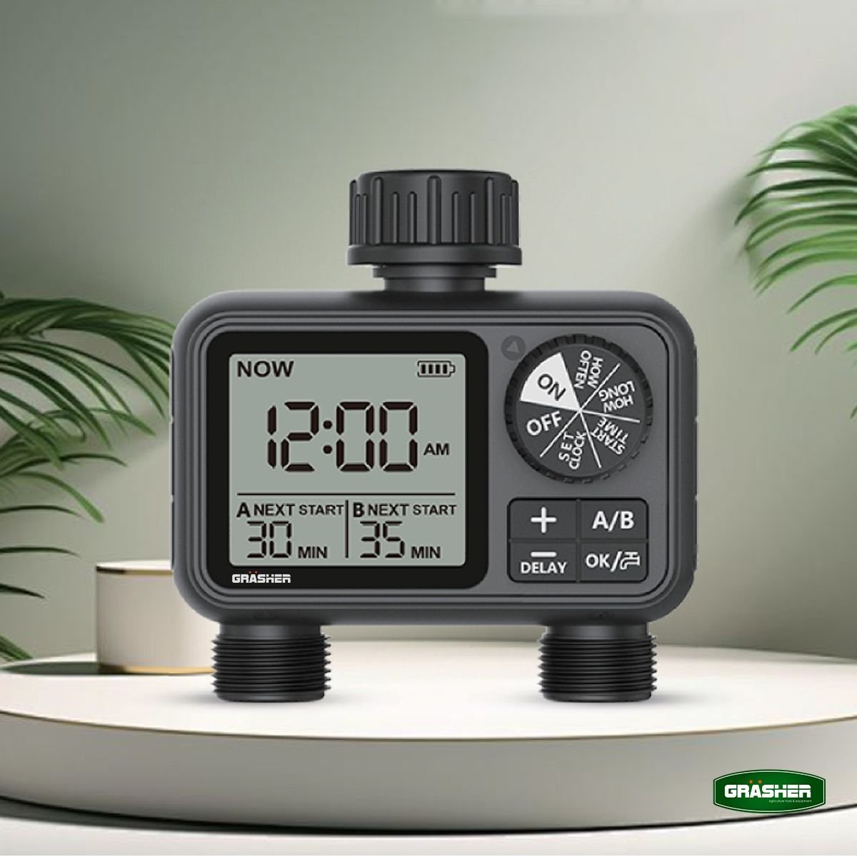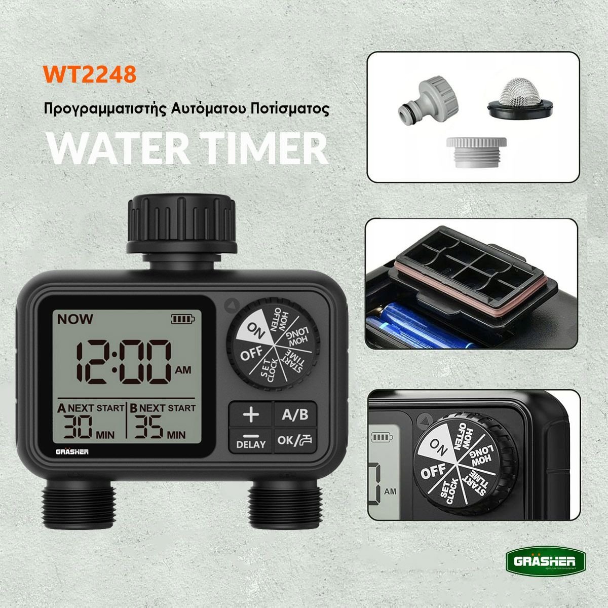 Ο ψηφιακός προγραμματιστής ποτίσματος GRASHER WT2248 με 2 εξόδους είναι η έξυπνη λύση για αυτόματο και ελεγχόμενο πότισμα σε κήπους, γλάστρες και μικρές καλλιέργειες. Σχεδιασμένος για εύκολη εγκατάσταση στη βρύση, σου επιτρέπει να ρυθμίζεις με ακρίβεια τη διάρκεια και τη συχνότητα ποτίσματος, εξοικονομώντας χρόνο και νερό.