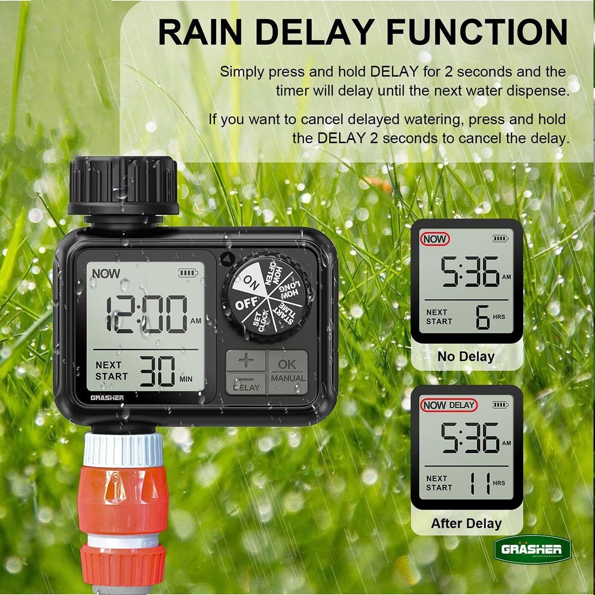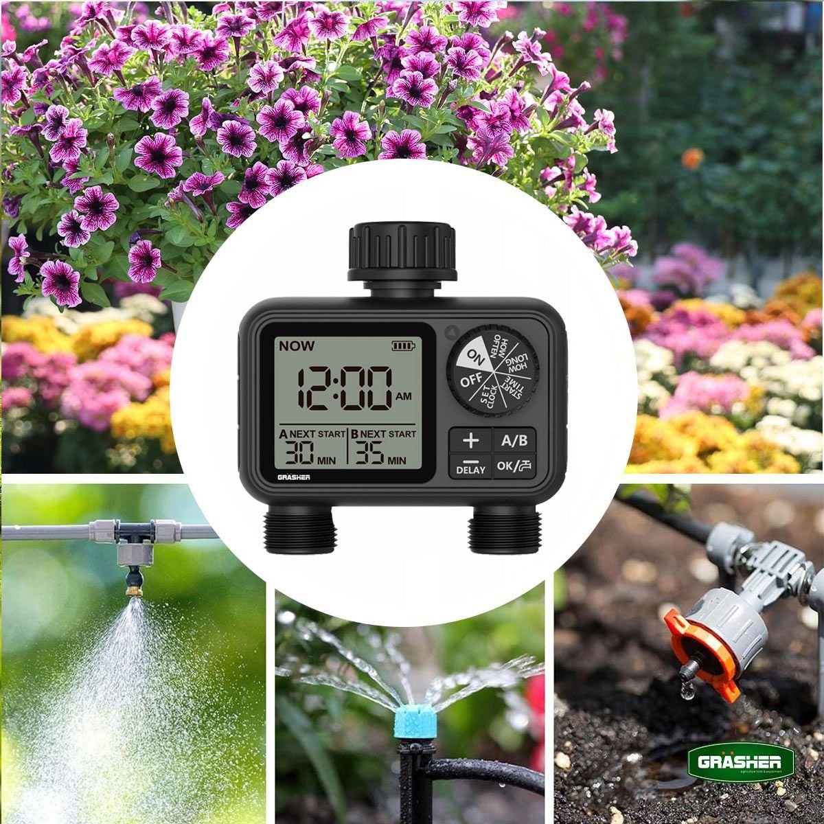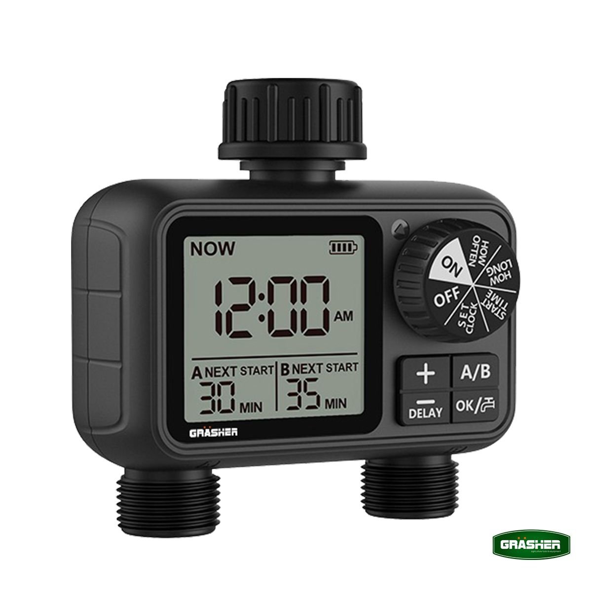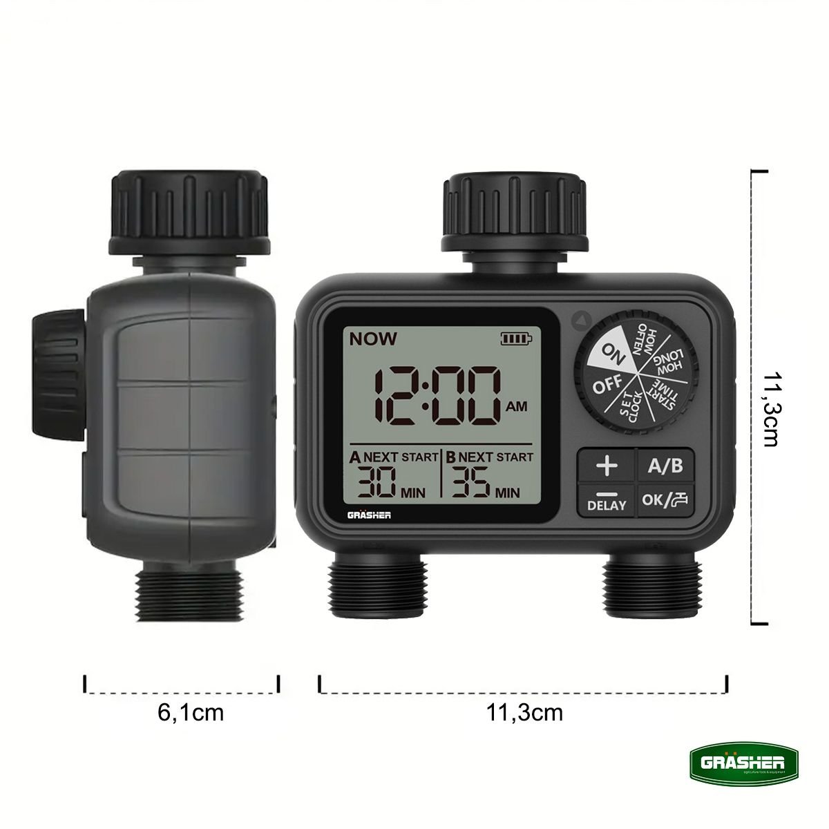 Ο ψηφιακός προγραμματιστής ποτίσματος GRASHER WT2248 με 2 εξόδους είναι η έξυπνη λύση για αυτόματο και ελεγχόμενο πότισμα σε κήπους, γλάστρες και μικρές καλλιέργειες. Σχεδιασμένος για εύκολη εγκατάσταση στη βρύση, σου επιτρέπει να ρυθμίζεις με ακρίβεια τη διάρκεια και τη συχνότητα ποτίσματος, εξοικονομώντας χρόνο και νερό.