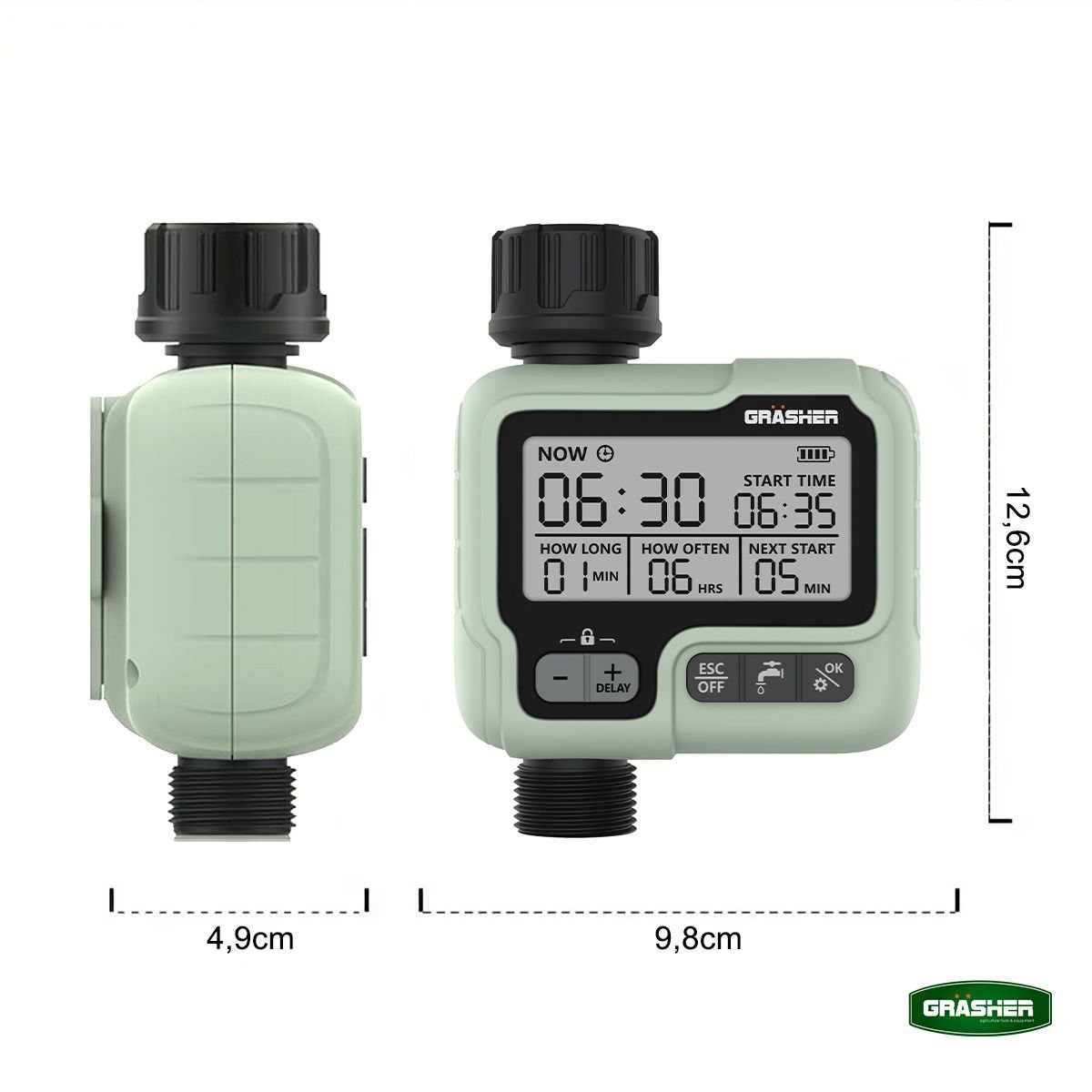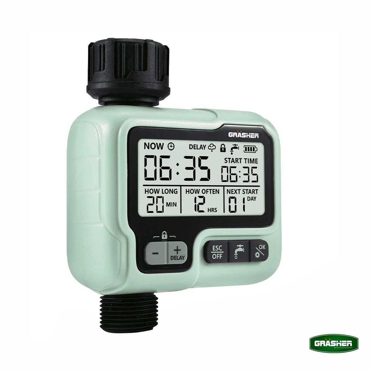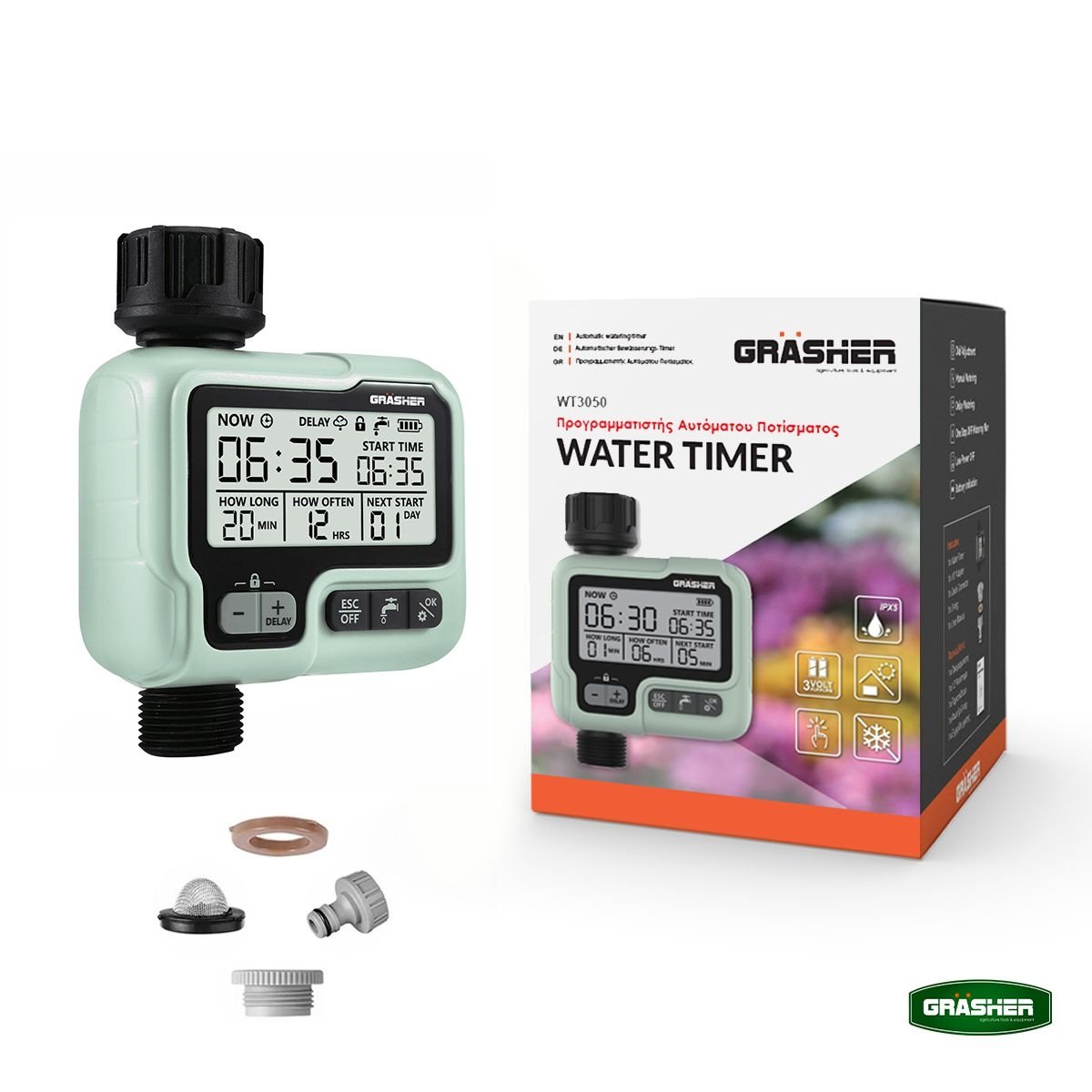 Ο ψηφιακός προγραμματιστής ποτίσματος GRASHER WT3050 είναι η πρακτική λύση για αυτόματο, σταθερό και ελεγχόμενο πότισμα σε κήπους, γλάστρες και μικρές καλλιέργειες. Με 1 πρόγραμμα, LCD οθόνη και χειροκίνητη λειτουργία ON-OFF, προσφέρει απλή χρήση χωρίς περιττές ρυθμίσεις.