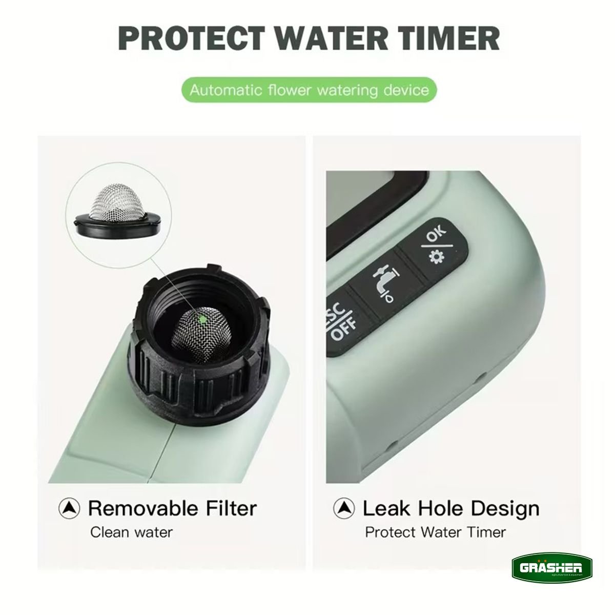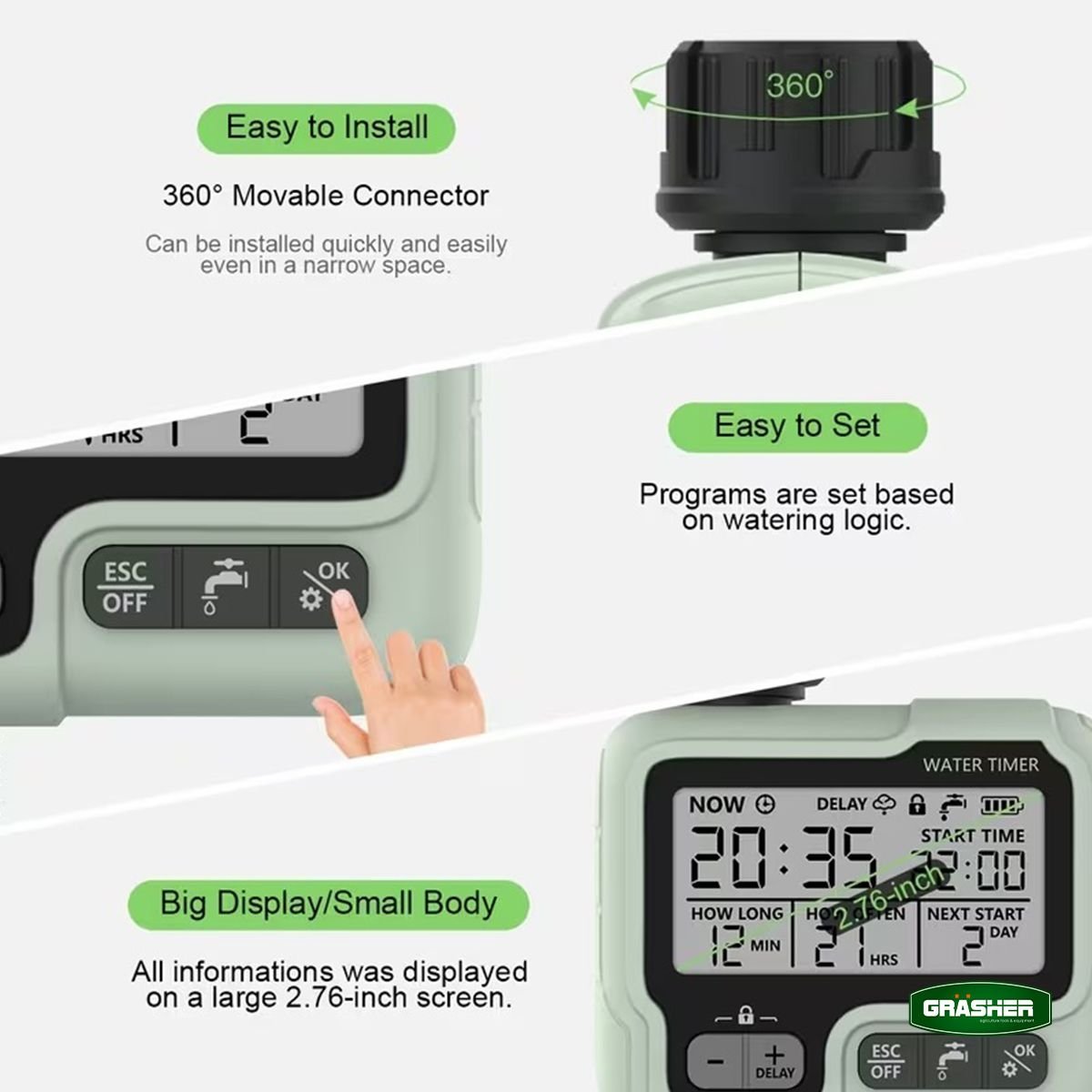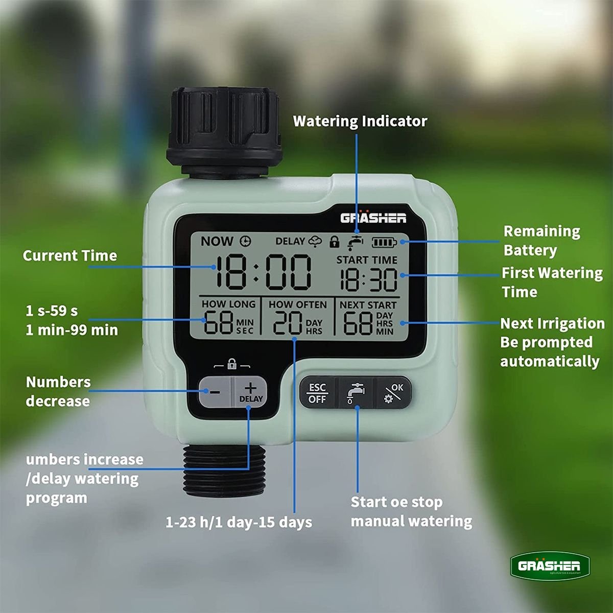 Ο ψηφιακός προγραμματιστής ποτίσματος GRASHER WT3050 είναι η πρακτική λύση για αυτόματο, σταθερό και ελεγχόμενο πότισμα σε κήπους, γλάστρες και μικρές καλλιέργειες. Με 1 πρόγραμμα, LCD οθόνη και χειροκίνητη λειτουργία ON-OFF, προσφέρει απλή χρήση χωρίς περιττές ρυθμίσεις.