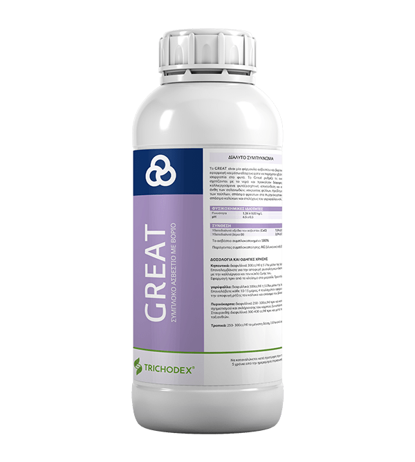 Το GREAT είναι ένα πλήρως ισορροπημένο υγρό σκεύασμα ασβεστίου και βορίου που ενισχύει άμεσα τη δομή του φυτού, βελτιώνει τη μετακίνηση θρεπτικών και προλαμβάνει κρίσιμες φυσιολογικές διαταραχές. Η προσεγμένη σύνθεση του προσφέρει υψηλή απορρόφηση, σταθερότητα pH και άμεση δράση τόσο σε διαφυλλική όσο και σε εφαρμογή εδάφους.
