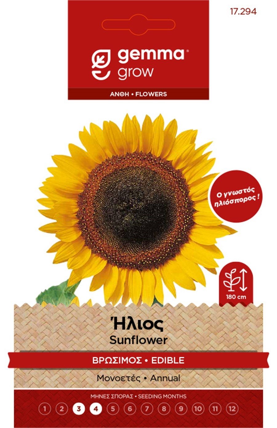 Ο Ήλιος Βρώσιμος Gemma (Helianthus annuus) είναι το κλασικό ηλιοτρόπιο που παράγει θρεπτικούς, βρώσιμους σπόρους υψηλής διατροφικής αξίας. Πρόκειται για μονοετές, εντυπωσιακό φυτό ύψους έως 180 cm, με μεγάλα χρυσοκίτρινα άνθη που λατρεύουν τον ήλιο.