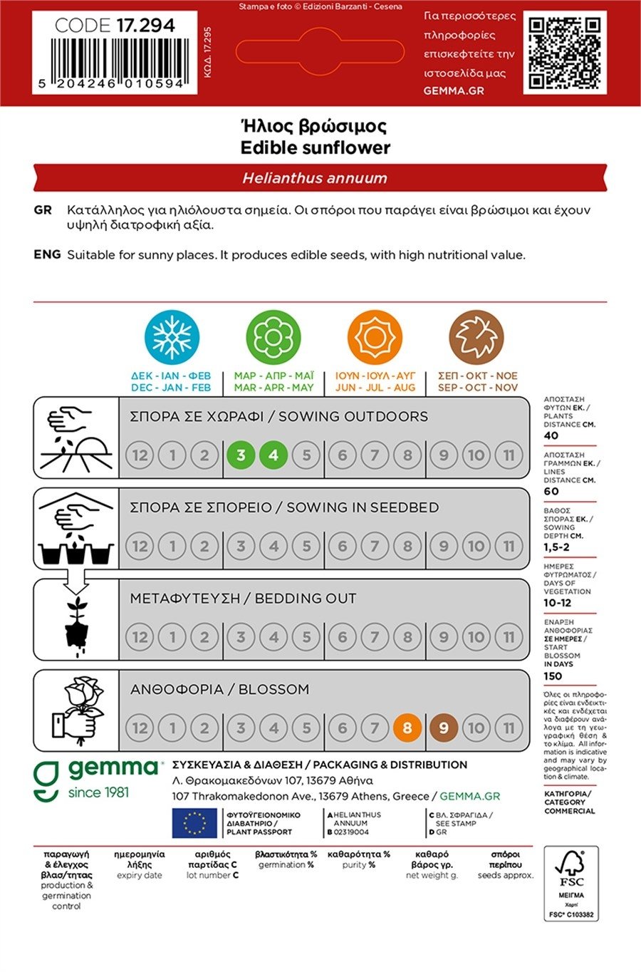 Καλλιεργείται εύκολα σε κήπους ή χωράφια, προτιμά ηλιόλουστα σημεία και προσφέρει υψηλή απόδοση σπόρων ιδανικών για κατανάλωση ή χρήση σε σαλάτες, σνακ και μαγειρική. Με τη σίγουρη ποιότητα των σπόρων Gemma, εξασφαλίζεις υγιή ανάπτυξη, σταθερή παραγωγή και ανθεκτικότητα στις ελληνικές συνθήκες. 🌞