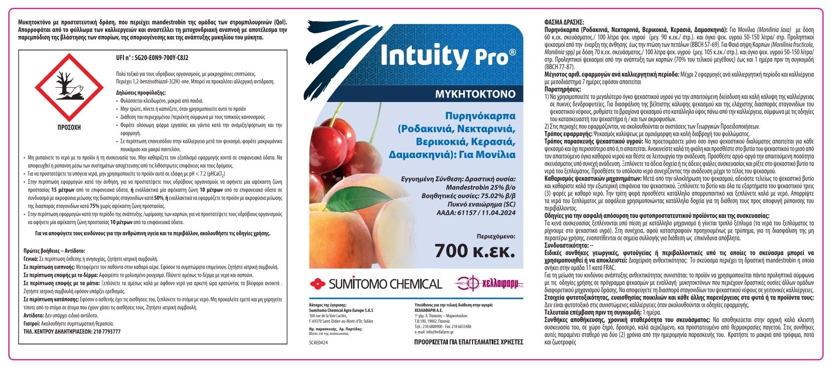 Θωρακίστε την παραγωγή σας με το INTUITY PRO, το νέο, πανίσχυρο μυκητοκτόνο της Sumitomo Chemical που έρχεται να αλλάξει τα δεδομένα στον έλεγχο της Μονίλιας. Με τη νέα δραστική ουσία Mandestrobin (25%), το INTUITY PRO προσφέρει εξειδικευμένη δράση και στα τρία είδη Μονίλιας (Monilinia laxa, M. fructigena, M. fructicola), προστατεύοντας τα Πυρηνόκαρπα (Κερασιά, Ροδακινιά, Νεκταρινιά, Βερικοκιά, Δαμασκηνιά) από την άνθηση έως και τη συγκομιδή.