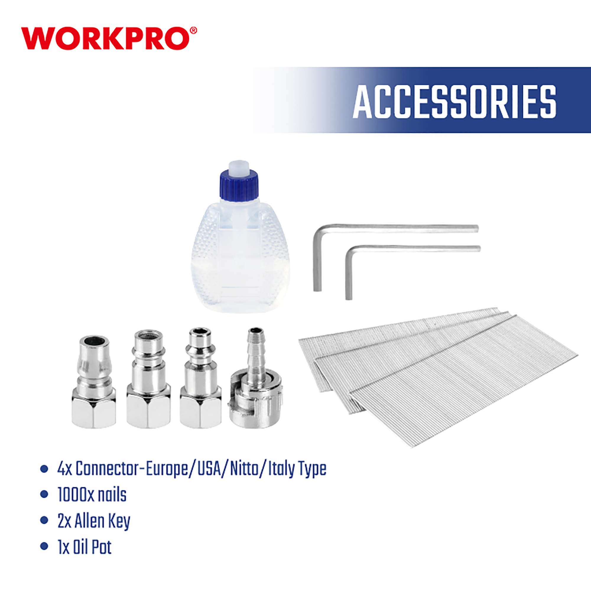 ● Εξαρτήματα: 1000 πρόκες, 4 συνδέσεις αέρα, δοχείο λαδιού, 2 κλειδιά allen