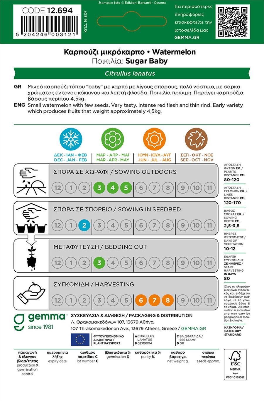 Χάρη στους ποιοτικούς σπόρους Gemma, εξασφαλίζει υψηλή φυτρωτικότητα, ομοιομορφία καρπών και ταχεία ωρίμανση σε μόλις 80–85 ημέρες. Είναι γλυκό, ζουμερό και εξαιρετικά δροσιστικό, με σάρκα που λιώνει στο στόμα. Το απόλυτο “mini” καλοκαιρινό καρπούζι για κάθε λάτρη του φρέσκου και φυσικού προϊόντος.