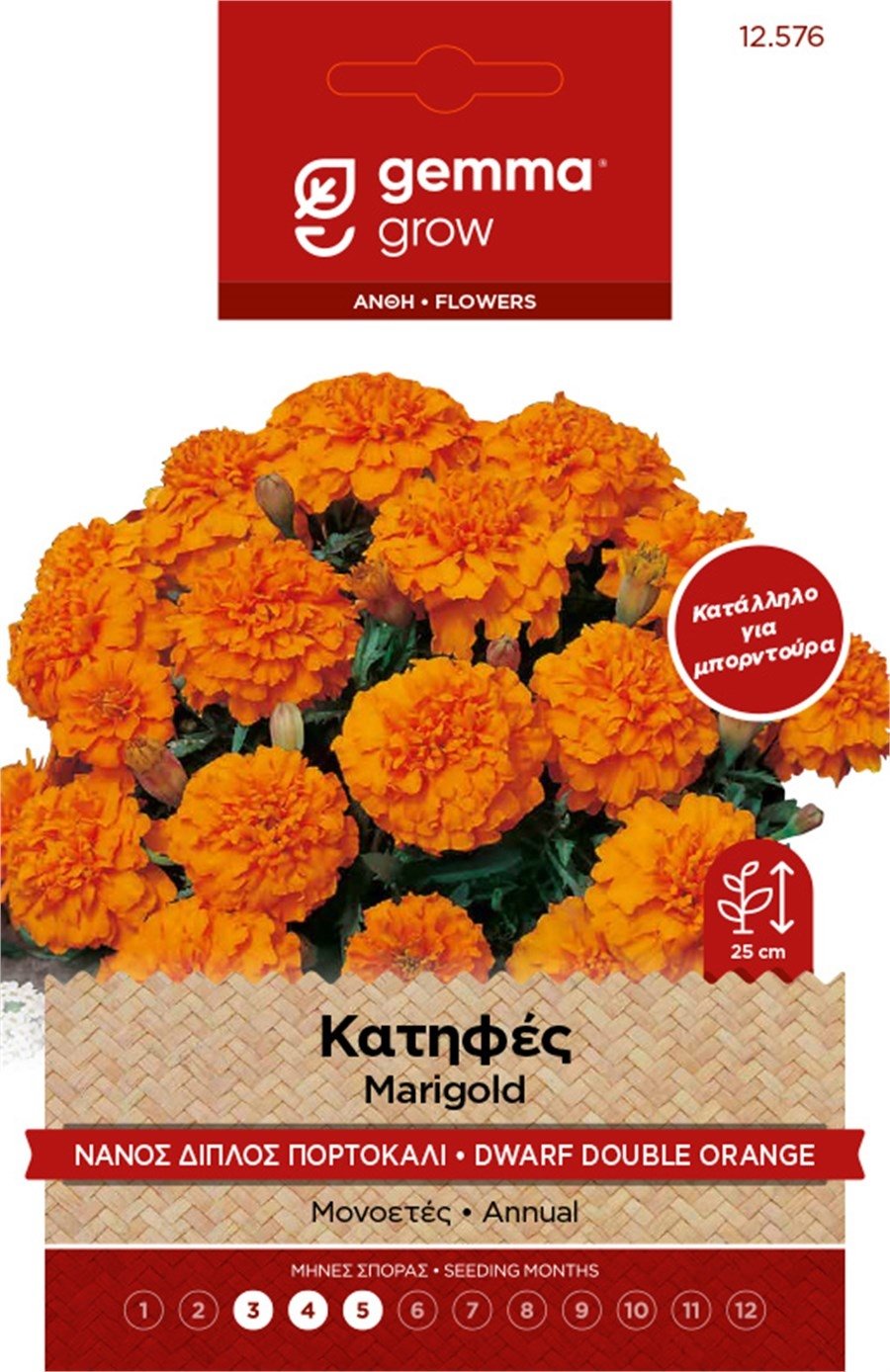 Ο Κατηφές Νάνος Διπλός Πορτοκαλί Gemma είναι η ιδανική επιλογή για όσους θέλουν έντονη, σταθερή ανθοφορία από την άνοιξη έως το φθινόπωρο. Με ζωηρό πορτοκαλί χρώμα και χαμηλό ύψος, δημιουργεί εντυπωσιακές μπορντούρες, παρτέρια και χρωματιστές γραμμές στον κήπο ή στις γλάστρες.