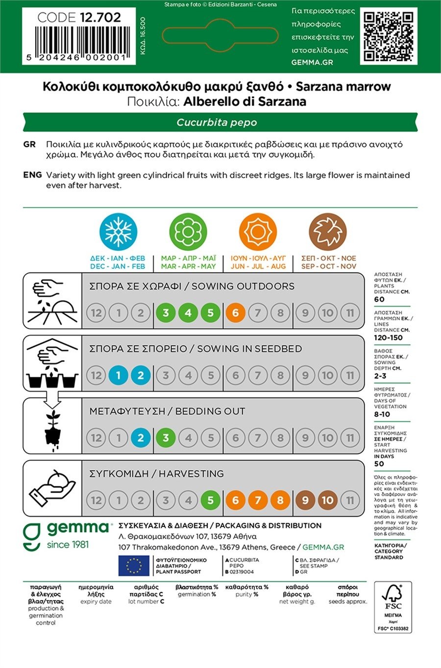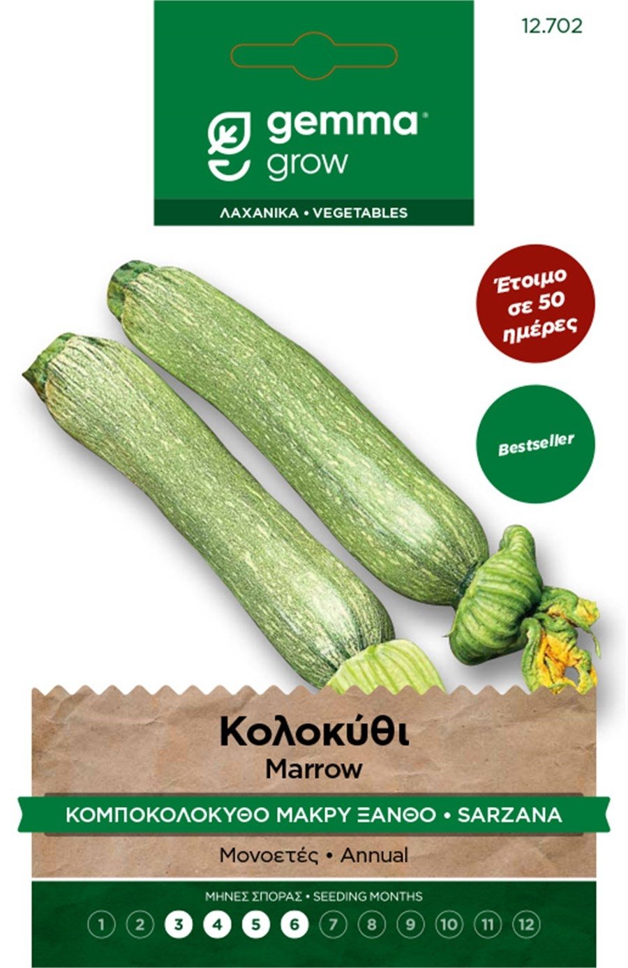 Το Κολοκύθι Μακρύ Ξανθό (Alberello di Sarzana, Cucurbita pepo) της Gemma είναι το bestseller που δίνει σταθερά μακριούς, κυλινδρικούς καρπούς 18–20 cm με απαλό ανοιχτοπράσινο χρώμα και διακριτικές ραβδώσεις. Η ποικιλία είναι έτοιμη για συγκομιδή σε ~50 ημέρες, με μεγάλο άνθος που διατηρείται και μετά τη συγκομιδή — ιδανικό για κουζίνα (τηγάνι, σχάρα, γεμιστά, tempura ανθών).