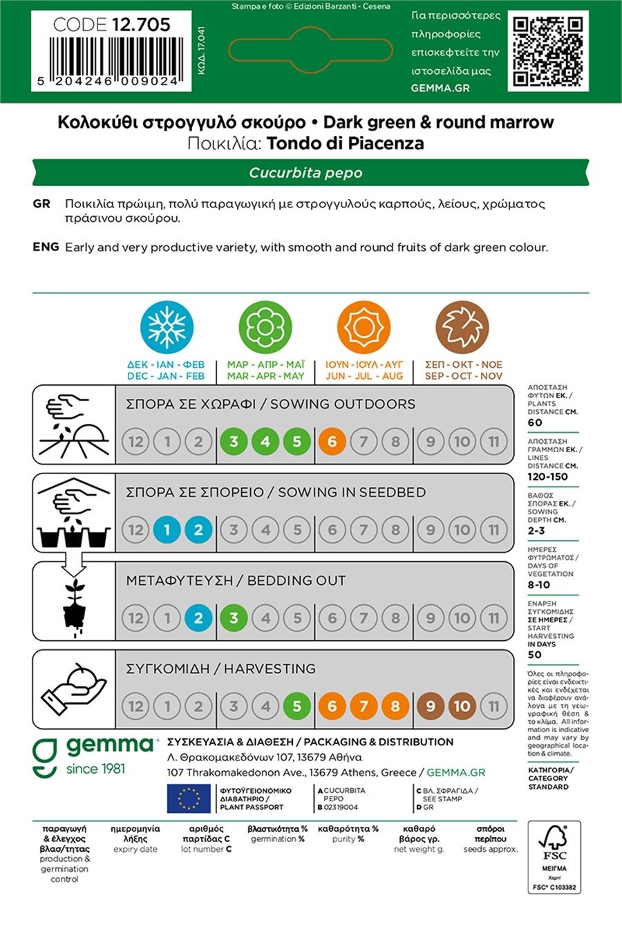 Το Κολοκύθι Στρογγυλό Σκούρο (Tondo di Piacenza, Cucurbita pepo) της Gemma δίνει ομοιόμορφους, λείους, σκουροπράσινους καρπούς ιδανικούς για γεμιστά και γρήγορες δημιουργίες. Η ποικιλία είναι πρώιμη και πολύ παραγωγική, με βλάστηση σε 8–10 ημέρες και συγκομιδή στις ~50 ημέρες, προσφέροντας συνεχείς κοπές από Άνοιξη έως Φθινόπωρο.