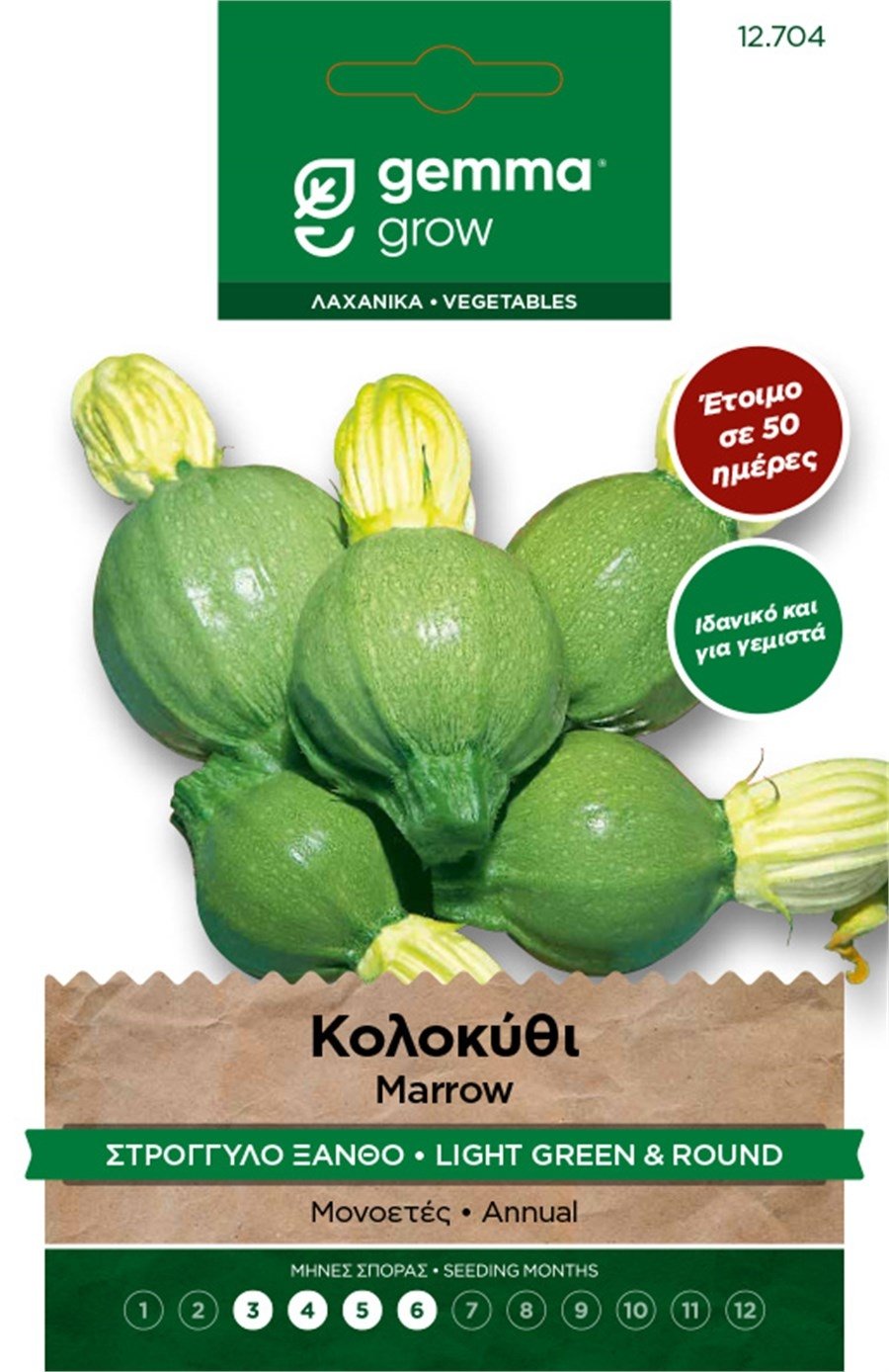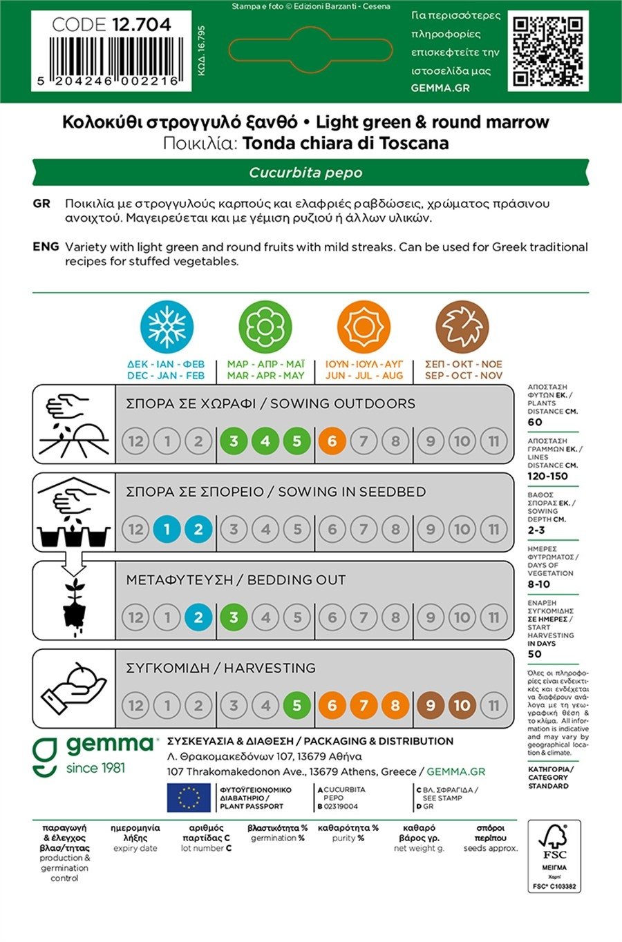 Το Κολοκύθι Στρογγυλό Ξανθό (Tonda Chiara di Toscana, Cucurbita pepo) της Gemma είναι πρώιμη ποικιλία που δίνει ομοιόμορφους στρογγυλούς καρπούς με ελαφριές ραβδώσεις και ανοιχτό πράσινο χρώμα. Είναι το «μυστικό» για τέλεια γεμιστά και σταθερή παραγωγή από Άνοιξη έως Φθινόπωρο.