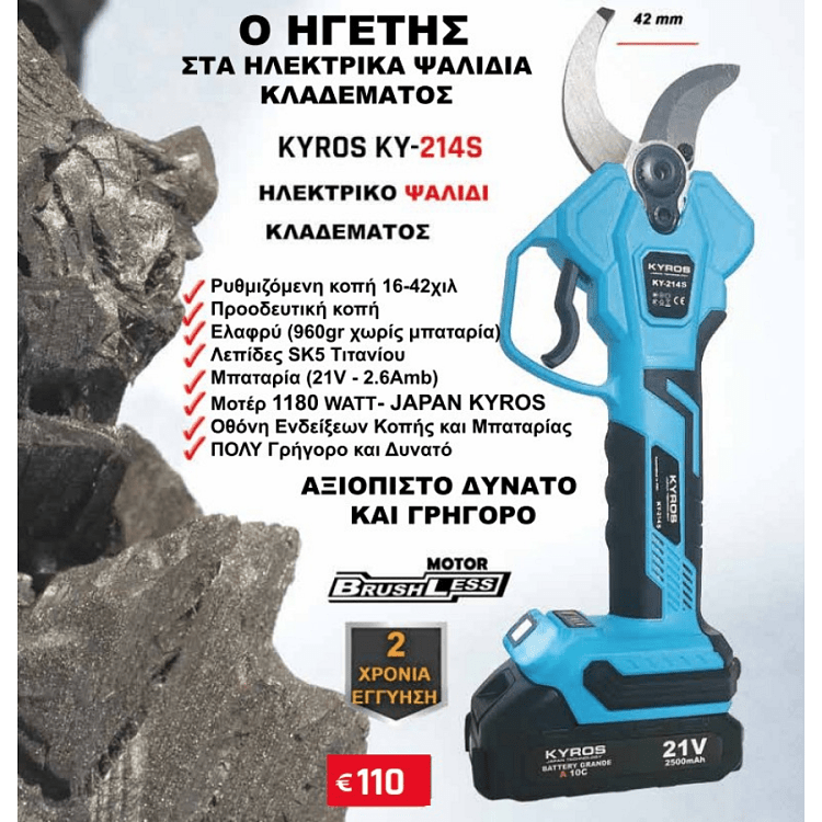 Το KYROS KY-214S είναι ένα ηλεκτρικό ψαλίδι κλαδέματος υψηλής απόδοσης, σχεδιασμένο για όσους απαιτούν δύναμη, ταχύτητα και απόλυτη αξιοπιστία στο καθημερινό κλάδεμα. Με λεπίδες SK5 Τιτανίου, προοδευτική κοπή και μέγιστο άνοιγμα έως 42 mm, προσφέρει καθαρές και ακριβείς τομές ακόμη και σε σκληρά κλαδιά.