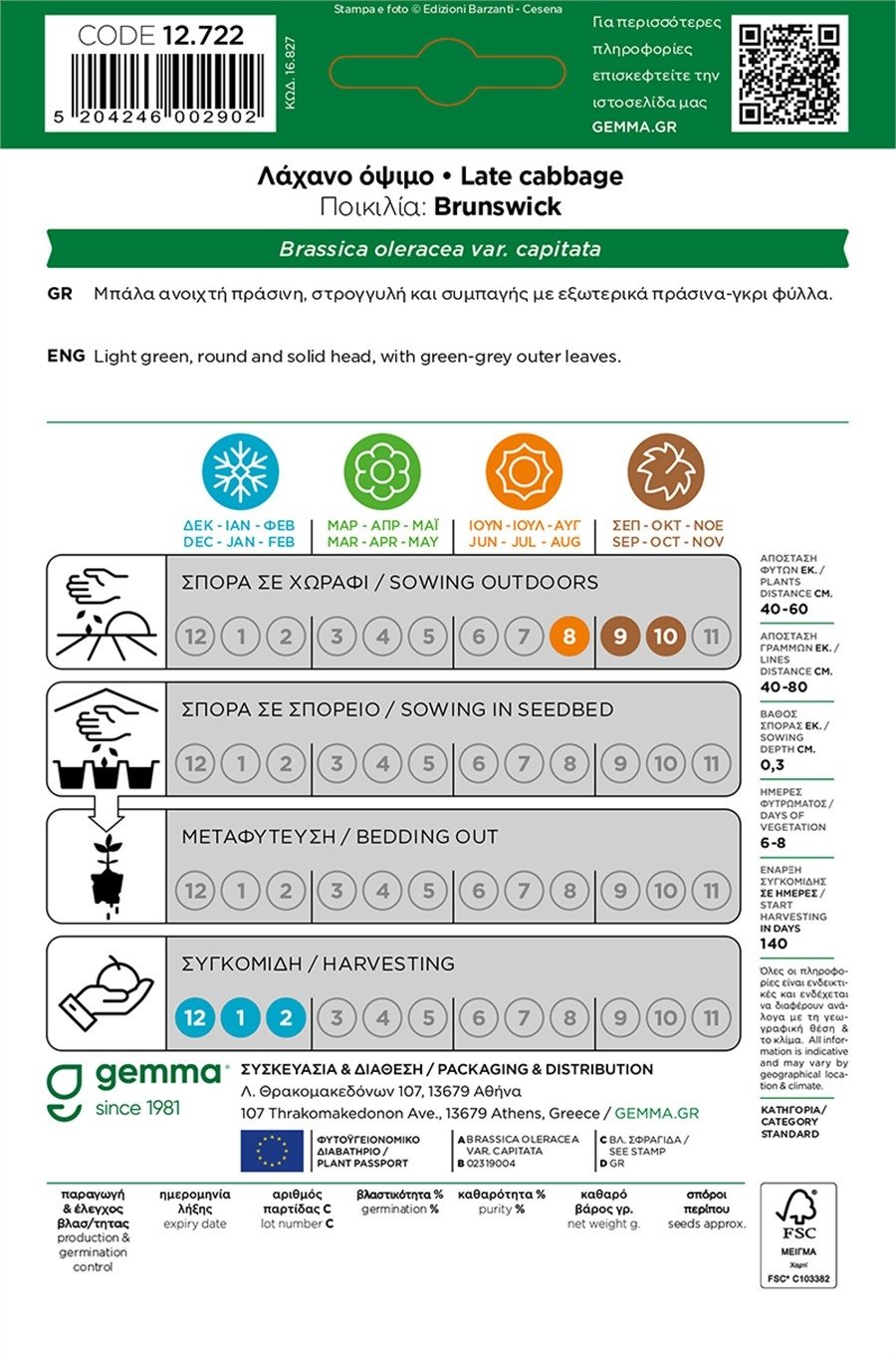 Το Λάχανο Όψιμο Brunswick της Gemma δίνει στρογγυλές, συμπαγείς κεφαλές 2,5–3 kg με ανοιχτό πράσινο χρώμα και εξωτερικά πρασινογκρί φύλλα — ιδανικό για τραγανές, γλυκές σαλάτες και καθημερινή κουζίνα. Είναι μονοετής, αξιόπιστη ποικιλία με σταθερή παραγωγή τον χειμώνα, ακόμη και σε δροσερά κλίματα.