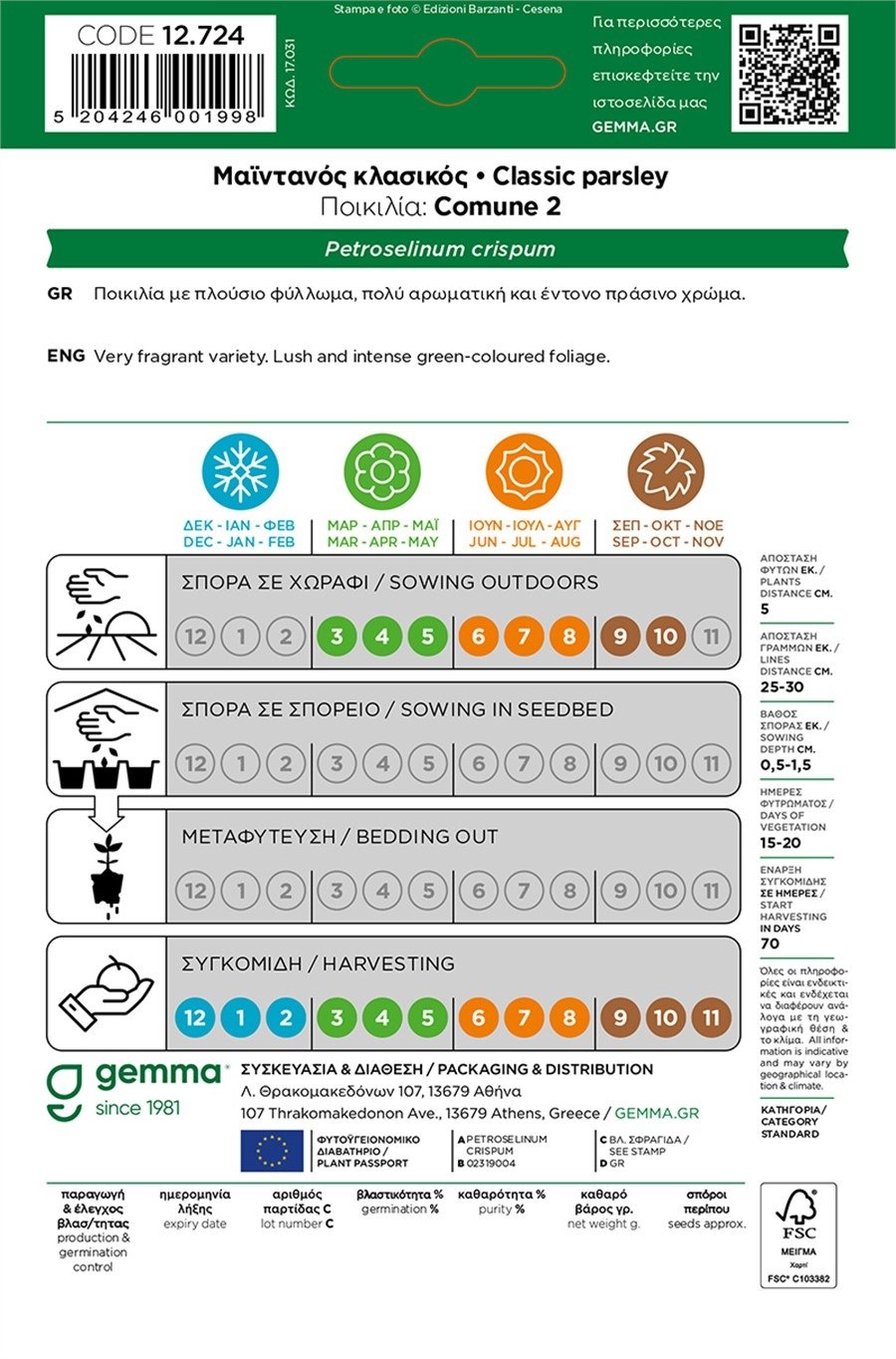 Ο Μαϊντανός Κλασικός Comune 2 της Gemma είναι η σίγουρη επιλογή για άφθονο, έντονα αρωματικό φύλλωμα με βαθύ πράσινο χρώμα. Ως διετής ποικιλία, δίνει σταθερή παραγωγή από την άνοιξη μέχρι τον χειμώνα, ιδανικός για κήπο, παρτέρια ή γλάστρα στο μπαλκόνι.