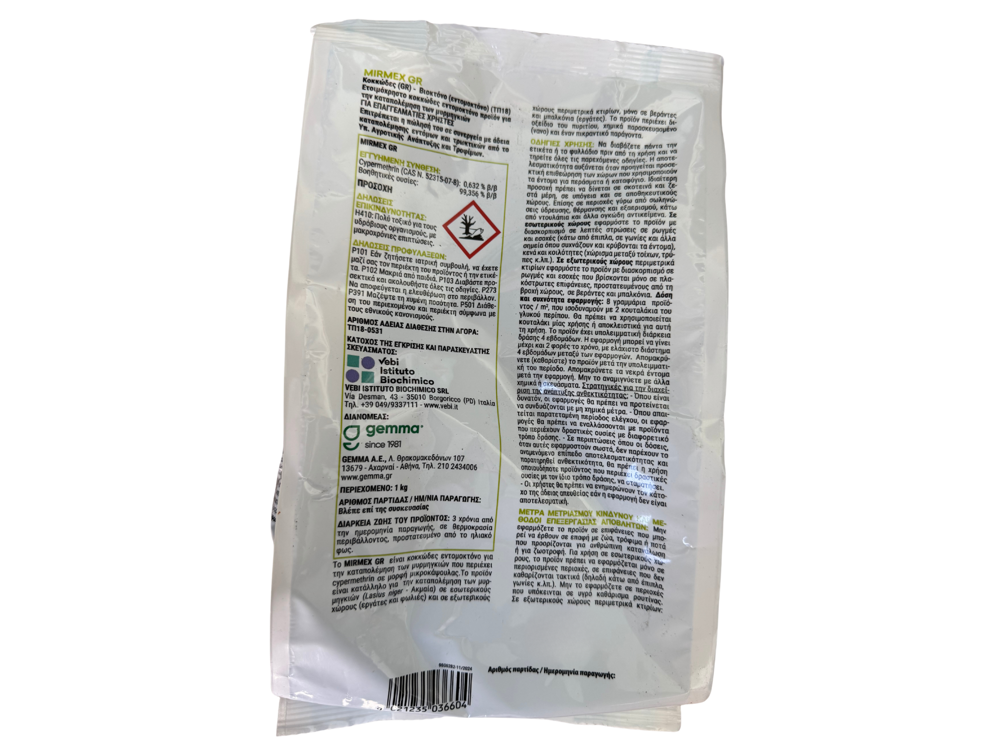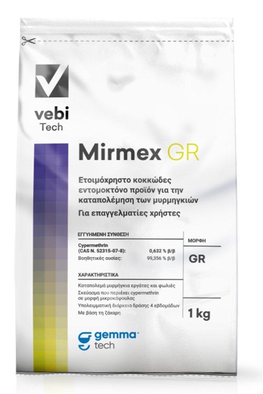 Το Mirmex GR 1 kg είναι επαγγελματική συσκευασία για εκτεταμένες εφαρμογές σε εσωτερικούς χώρους και περιμετρικά κτιρίων (μπαλκόνια/βεράντες). Ο ζαχαρούχος φορέας αυξάνει τη λήψη, ενώ η μεταφορά στη φωλιά επιτυγχάνει συστημική κατάρρευση της αποικίας. Εξασφαλίζει ομοιόμορφη κάλυψη μεγάλων επιφανειών με υπολειμματικότητα έως 4 εβδομάδες.