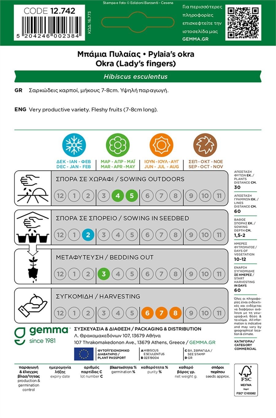 Η Μπάμια Gemma (Okra – Lady’s Fingers) είναι μια μονοετής ποικιλία υψηλής διατροφικής αξίας, με σαρκώδεις καρπούς μήκους 7-8 cm, πλούσιους σε φυτικές ίνες, βιταμίνες C και K. Διακρίνεται για τη μεγάλη παραγωγικότητά της και την πρώιμη συγκομιδή μόλις σε 60 ημέρες από τη σπορά.