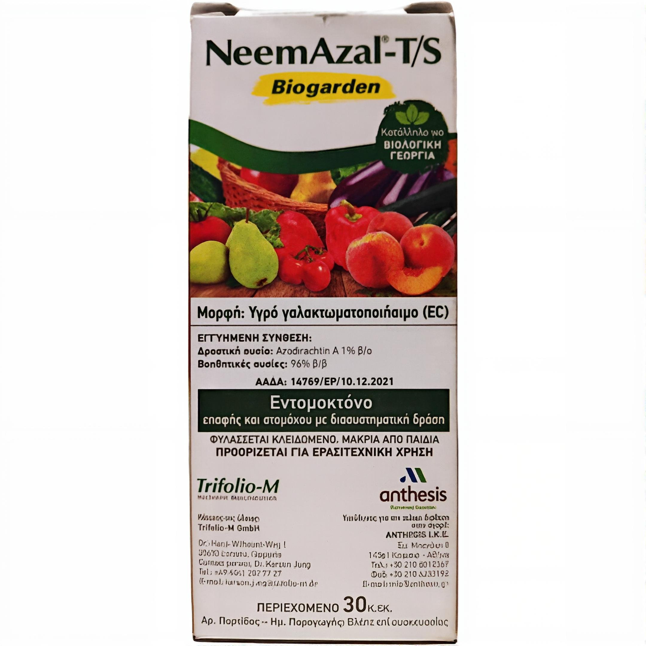 Ταλαιπωρήστε από έντομα που καταστρέφουν τις καλλιέργειές σας και αναζητάτε μια φυσική λύση χωρίς χημικά υπολείμματα; Το NeemAzal-T/S είναι το εντομοκτόνο φυσικής προέλευσης που χρειάζεστε. Πρόκειται για ένα προϊόν πατενταρισμένης εκχύλισης από το δέντρο Neem, που προσφέρει ευρύ φάσμα δράσης ενάντια σε λεπιδόπτερα, αφίδες και θρίπες.