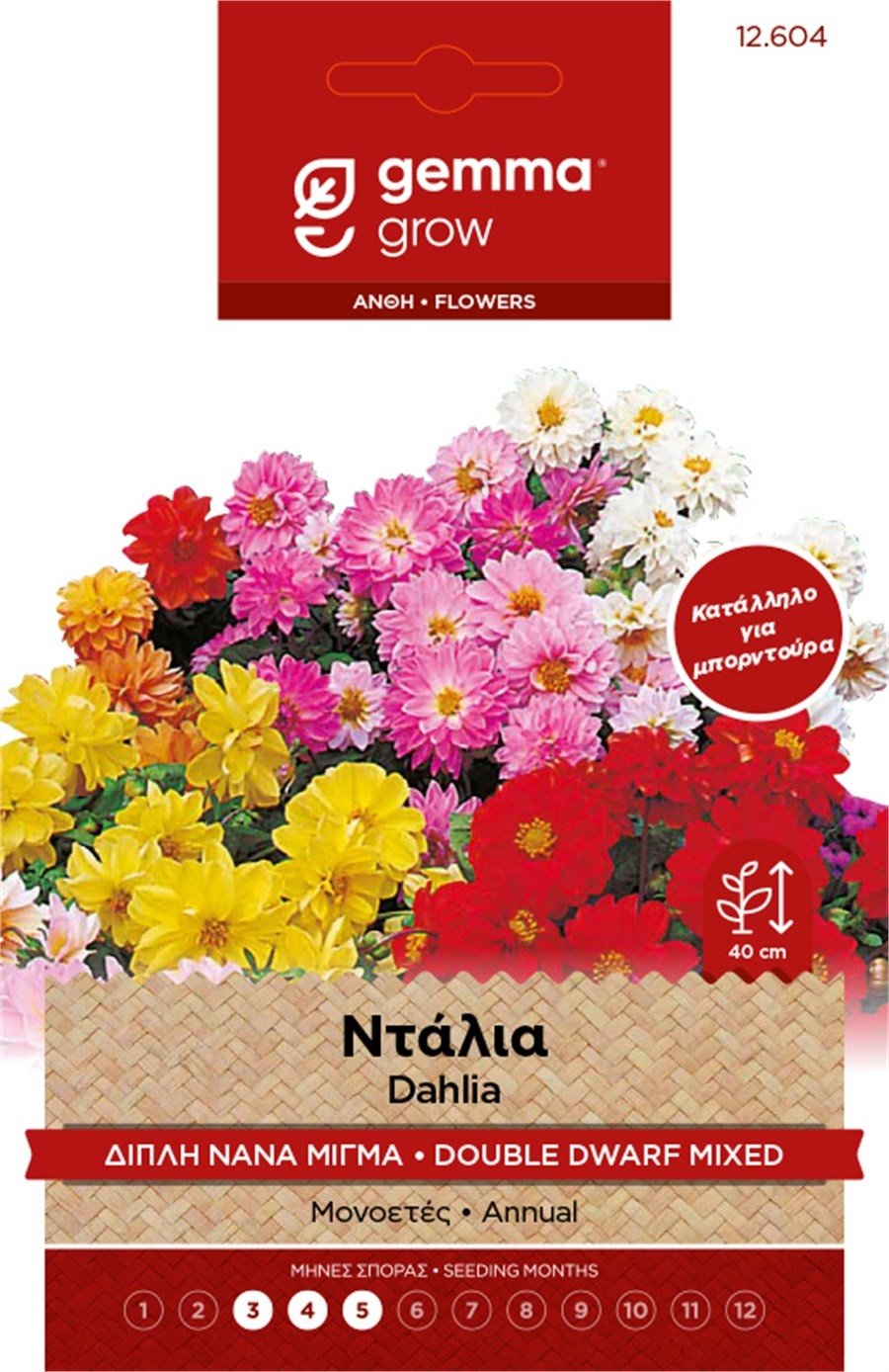 Η Ντάλια Διπλή Μίγμα Gemma είναι ένα μονοετές, εντυπωσιακό ανθοφόρο φυτό, ιδανικό για μπορντούρες, παρτέρια και κήπους που θέλουν έντονο χρώμα και πληθωρική εικόνα. Με μεγάλη ποικιλία αποχρώσεων και διπλά άνθη με πλούσια υφή, χαρίζει χρώμα από το καλοκαίρι μέχρι και το φθινόπωρο.