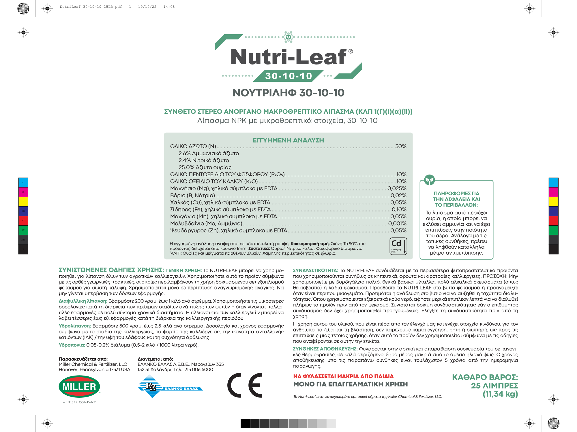 ● Ιχνοστοιχεία: Mg 0,0251%, B 0,02%, Cu 0,05%, Fe 0,1%, Mn 0,05%, Mo 0,001%, Zn 0,05%