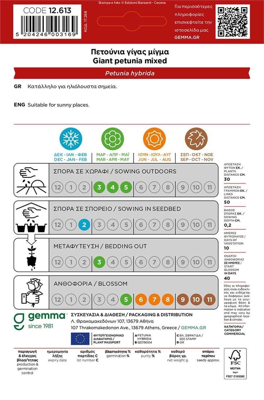Η Πετούνια Γίγας Μίγμα Gemma είναι η ιδανική επιλογή για όσους θέλουν γρήγορη, έντονη και πολύχρωμη ανθοφορία σε γλάστρες, ζαρντινιέρες και παρτέρια. Ως μονοετές φυτό, ανθίζει μόλις σε 40 ημέρες από τη σπορά, προσφέροντας μεγάλες ποσότητες λουλουδιών σε ζωηρά χρώματα που φωτίζουν κάθε χώρο.