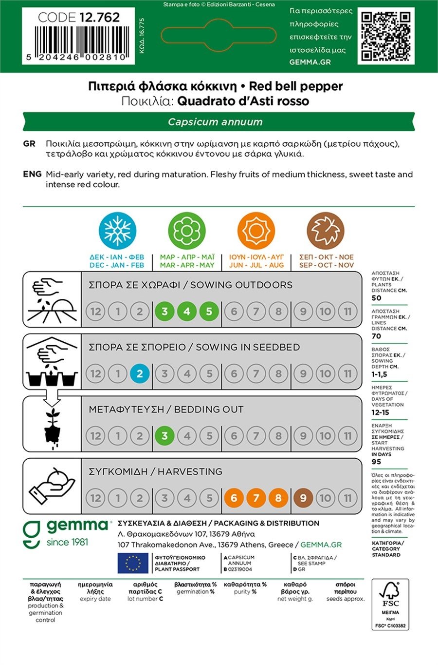 Η Πιπεριά Φλάσκα Κόκκινη Gemma (Quadrato d’Asti Rosso) είναι μια μεσοπρώιμη, γλυκιά ποικιλία με παχιά, σαρκώδη σάρκα και τετράλοβους καρπούς έντονου κόκκινου χρώματος. Η γεύση της είναι γλυκιά και πλούσια, ενώ οι καρποί της ξεχωρίζουν για το λαμπερό χρώμα και την εξαιρετική υφή τους.