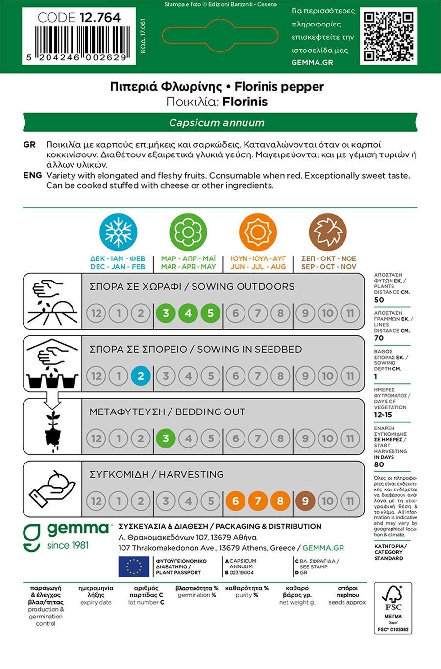 Η Πιπεριά Φλωρίνης Gemma (Florinis) είναι η αυθεντική ελληνική ποικιλία με επιμήκεις, σαρκώδεις και πεντανόστιμους καρπούς, που χαρίζουν έντονο κόκκινο χρώμα και μοναδικά αρώματα. Κατάλληλη για ψήσιμο, γέμιση με τυριά ή άλλες γεύσεις, αλλά και για σάλτσες, η Πιπεριά Φλωρίνης αποτελεί σύμβολο της ελληνικής γης και της παραδοσιακής κουζίνας.
