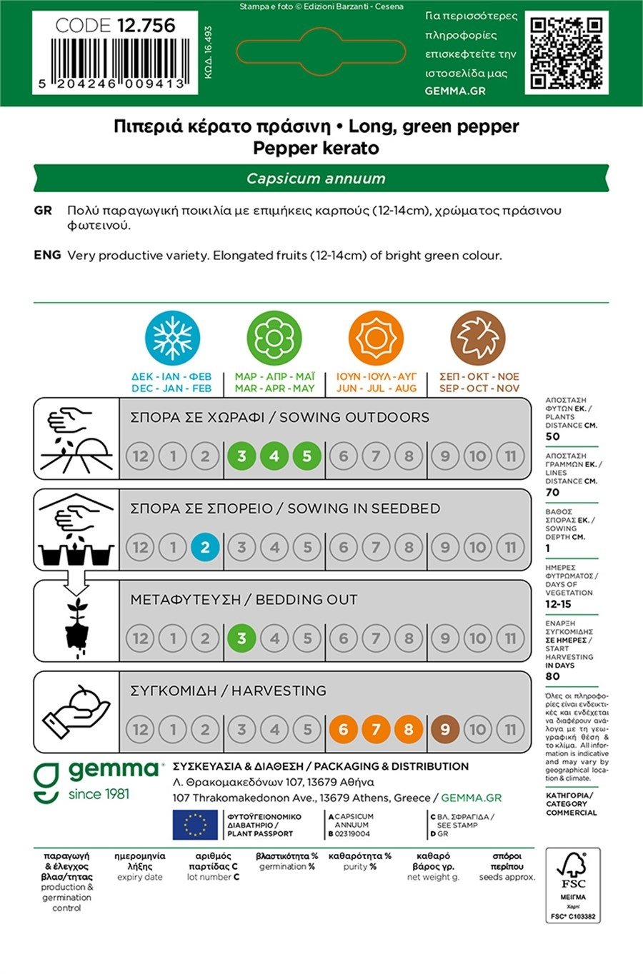 Η Πιπεριά Μακριά Κέρατο Πράσινη Gemma είναι η αγαπημένη επιλογή για κάθε λάτρη της φρέσκιας, γλυκιάς πιπεριάς. Με φωτεινό πράσινο χρώμα και καρπούς μήκους 12–14 cm, αποτελεί την τέλεια ποικιλία για σαλάτες, ψήσιμο ή γεμιστά.