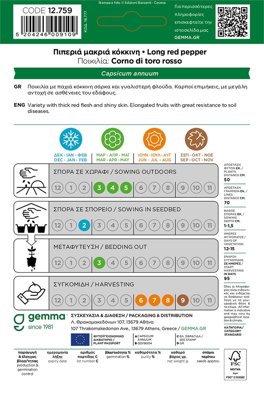 Η Πιπεριά Μακριά Κόκκινη Gemma είναι μια εξαιρετική γλυκιά ποικιλία για όσους επιθυμούν έντονη γεύση, πλούσιο χρώμα και μεγάλη ανθεκτικότητα. Οι καρποί της είναι επιμήκεις, με παχιά κόκκινη σάρκα και γυαλιστερή φλούδα, που παραμένει σταθερή ακόμη και μετά τη συγκομιδή.
