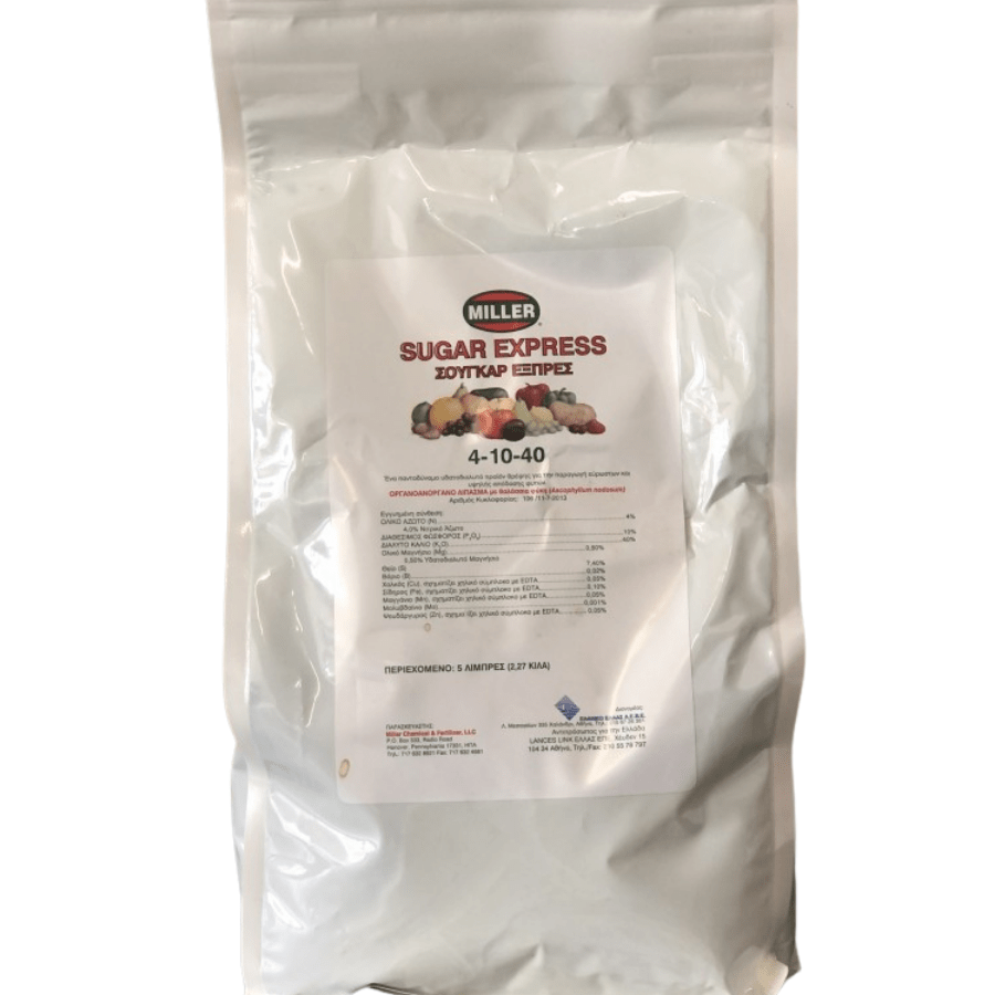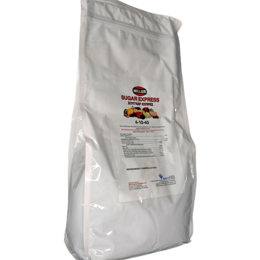 Το Sugar Express 4-10-40 είναι ένα διαφυλλικό λίπασμα υψηλής περιεκτικότητας σε Κάλιο (K), ειδικά σχεδιασμένο για τα τελικά στάδια ανάπτυξης του φυτού. Ενισχύει αποφασιστικά το μέγεθος των καρπών, συμβάλλει στην πρωίμηση και αυξάνει τα σάκχαρα, βελτιώνοντας τη γεύση, το χρώμα και τη συνολική εμπορική αξία.