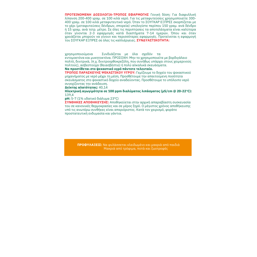 ● Ιχνοστοιχεία: Mg 0,5%, B 0,02%, Cu 0,05%, Fe 0,1%, Mn 0,05%, Mo 0,001%, Zn 0,05%